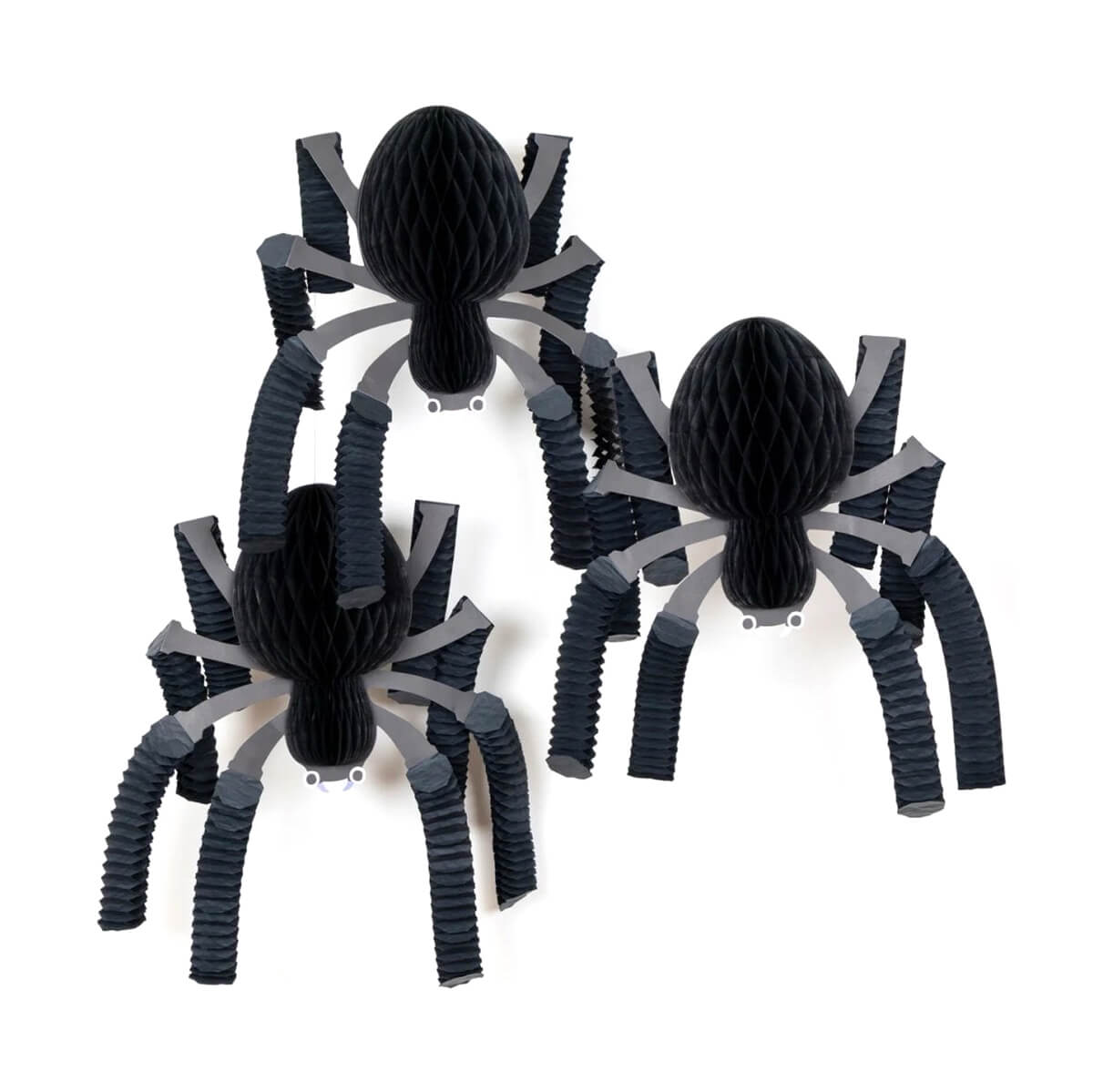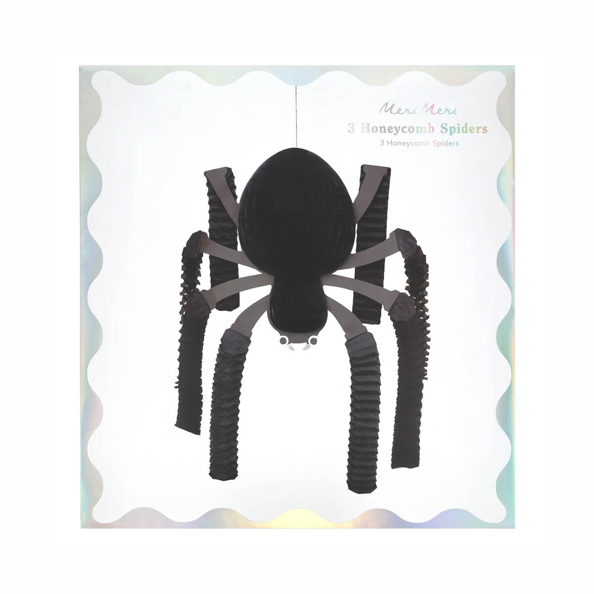 Spiders Honeycomb Decorations by Meri Meri. Trick or treat! Oversized spiders with big eyes, textured honeycomb bodies, silver foil pincers and long dangling legs. Hang them in the window, from trees and from the ceiling, the perfect spooktastic decoration! When the season's over, pack them away for next year.