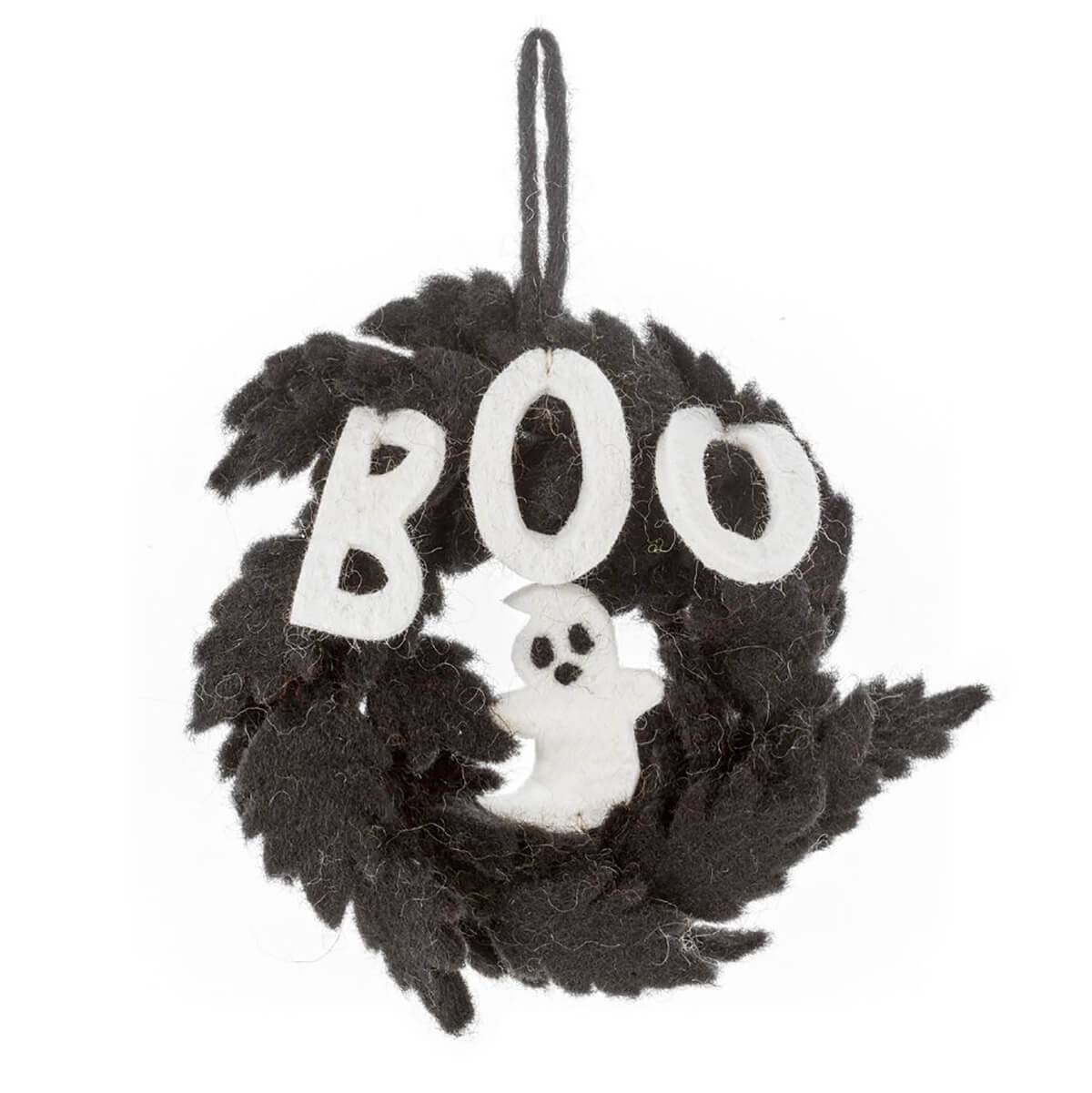 Spooky Ghost mini wreath felted Halloween hanging decoration by Felt So Good. This hand needle felted Halloween decoration is the perfect scary addition to your Halloween decorations and features a friendly little ghost, Boo lettering and Halloween leaves handstitched to a felt wrapped wire to keep the wreath's shape.
