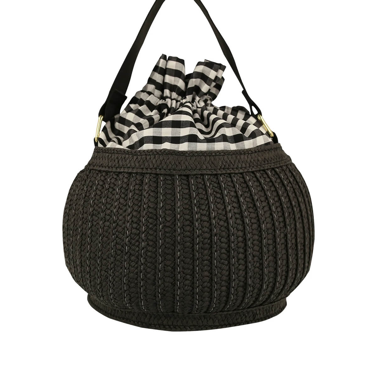 Woven black paper cat basket bag with ear details and stitched white, orange and mint paper raffia face details. Lined with black and white gingham fabric it fastens with a black drawstring cord. Black webbing handle with gold tone D-rings attached to the basket. Suitable for ages 4+