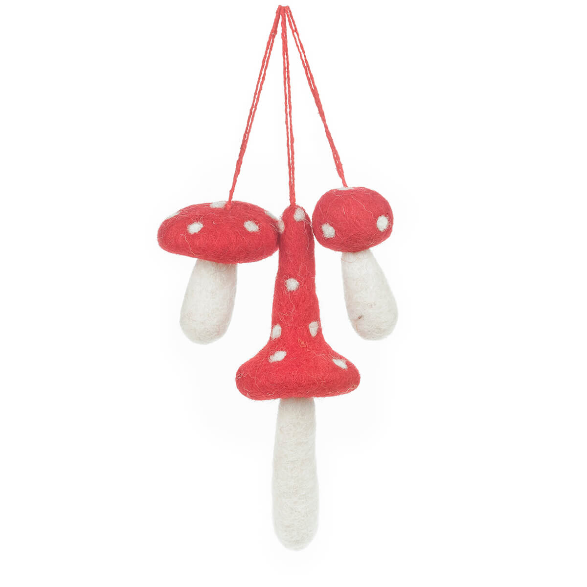 Wonky Toadstools hanging decoration by Felt So Good. Three wild felt toadstools, in three perfectly unique shapes and sizes! Perfect for any woodland or autumnal display, these wild toadstools have a a classic ruby red top, with white stem and white spots. Each hanging toadstool decoration has been ethicially handcrafted using sustainable materials and traditional needle felting and wet felting techniques. Crafted by a team of talented artisans in Nepal.