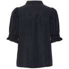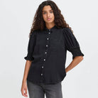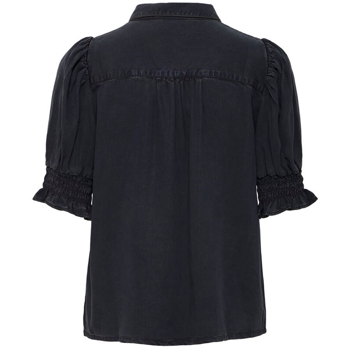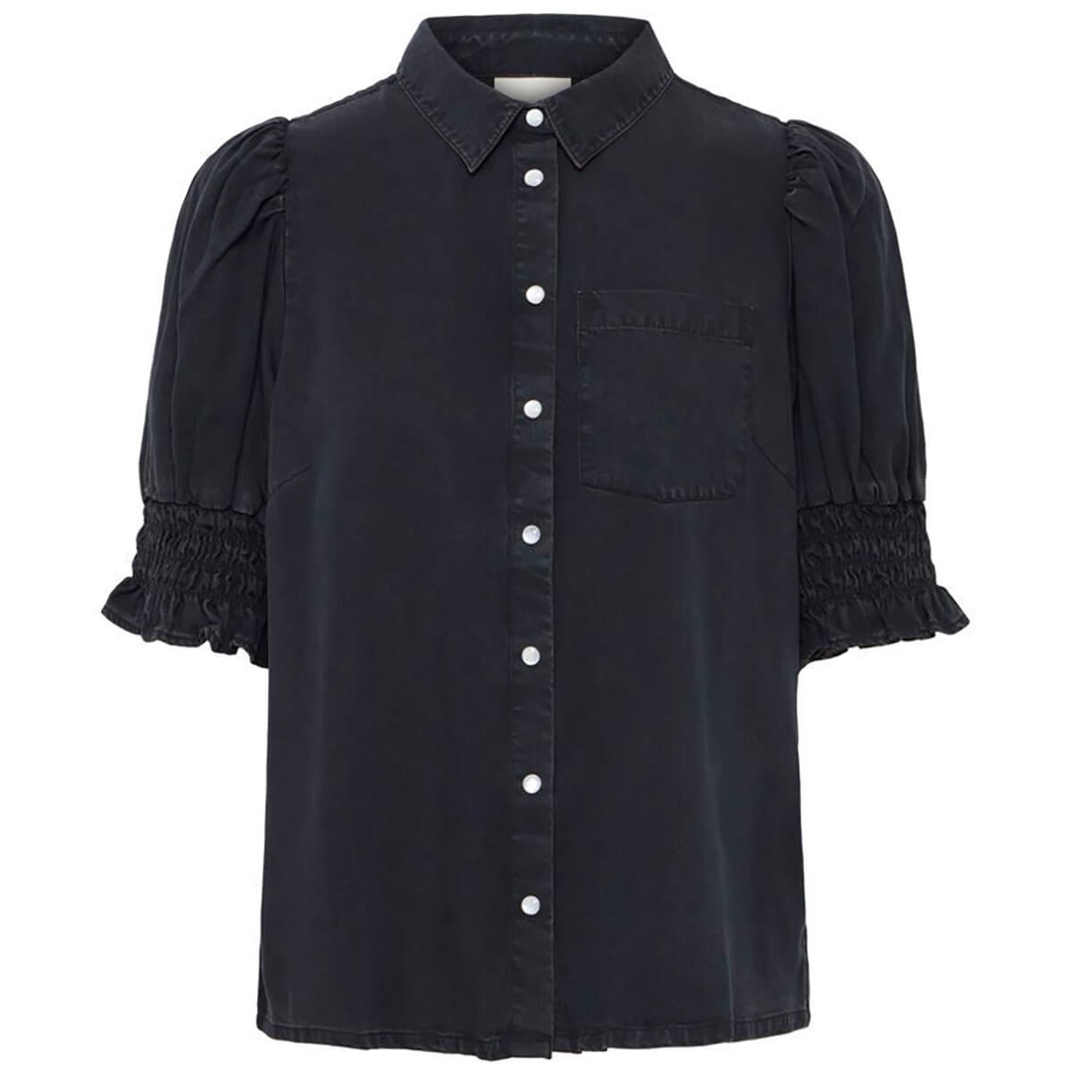 Borgie Shirt by ICHI. A short sleeved denim blouse with shirring detail on the sleeves and snap closure.