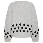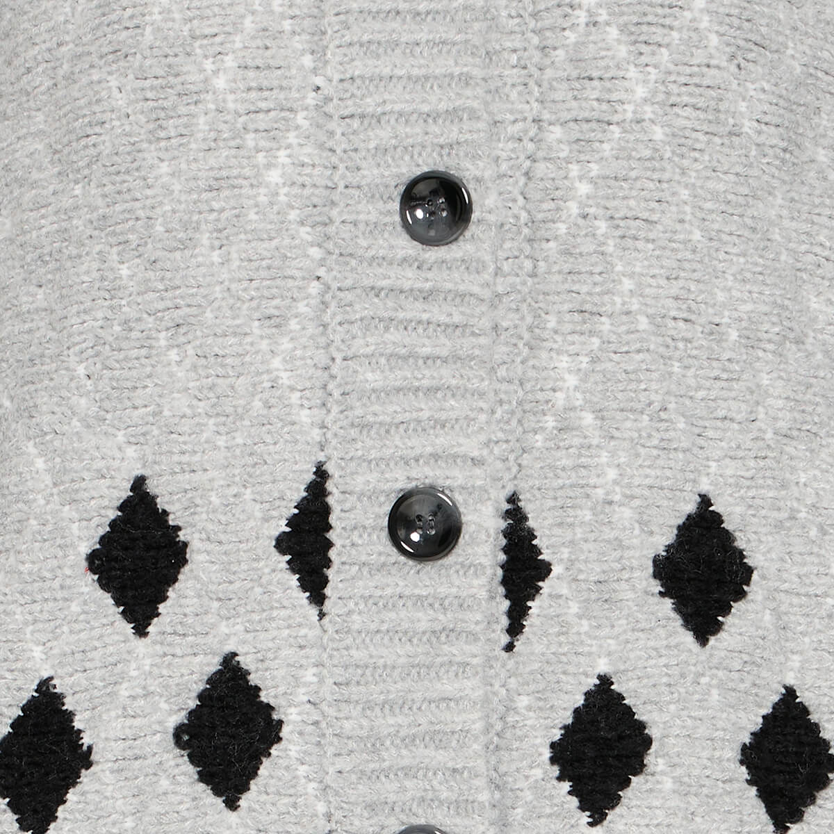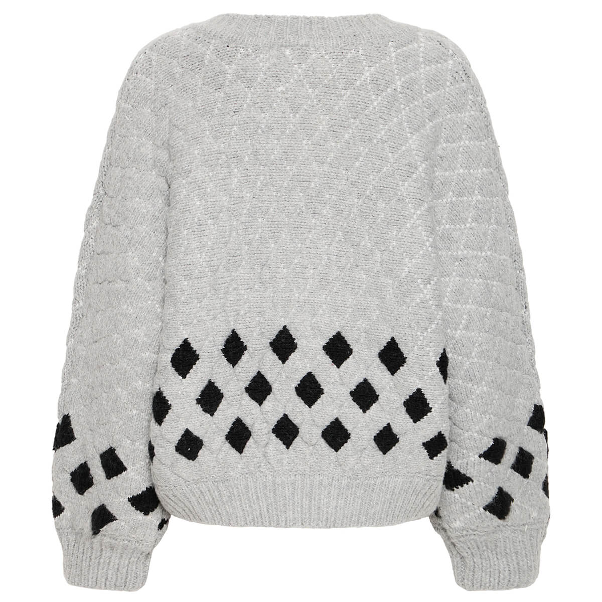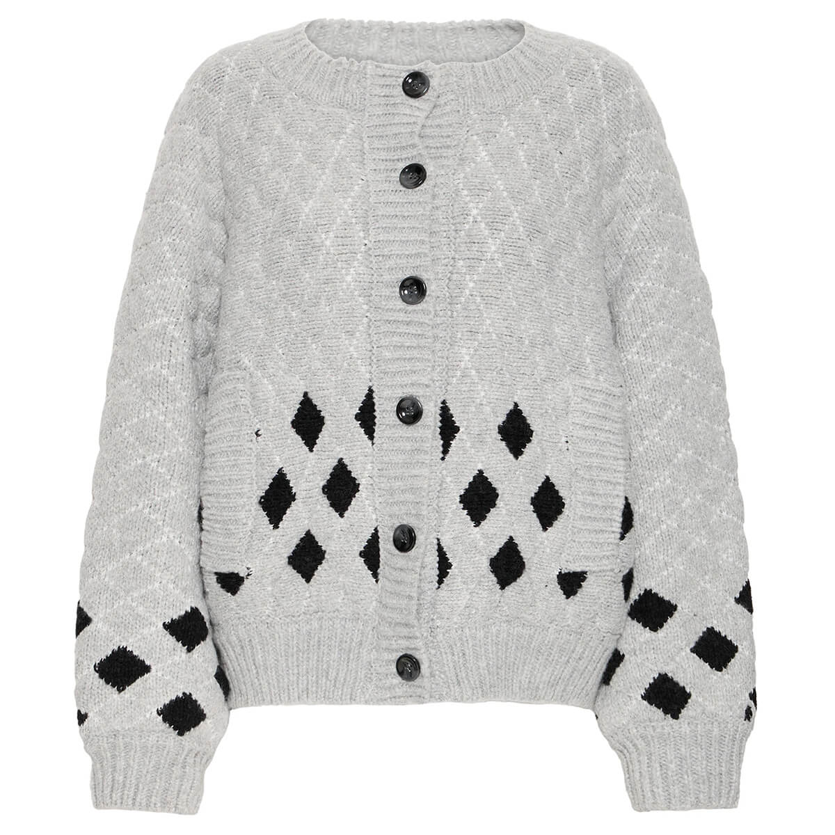 Cortana Cardigan by ICHI. This cosy grey cardigan brings a playful twist to classic knitwear with its bold black diamond pattern along the hem and sleeves.The relaxed silhouette and eye-catching geometric design make it a stylish yet comfortable choice for layering in cooler weather.