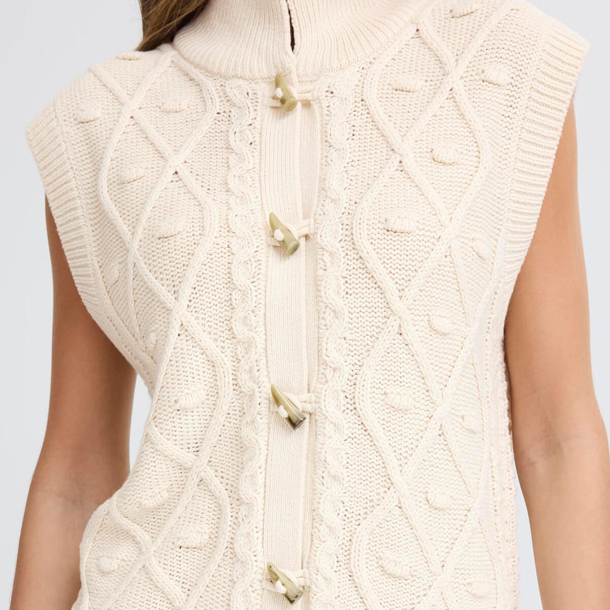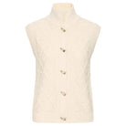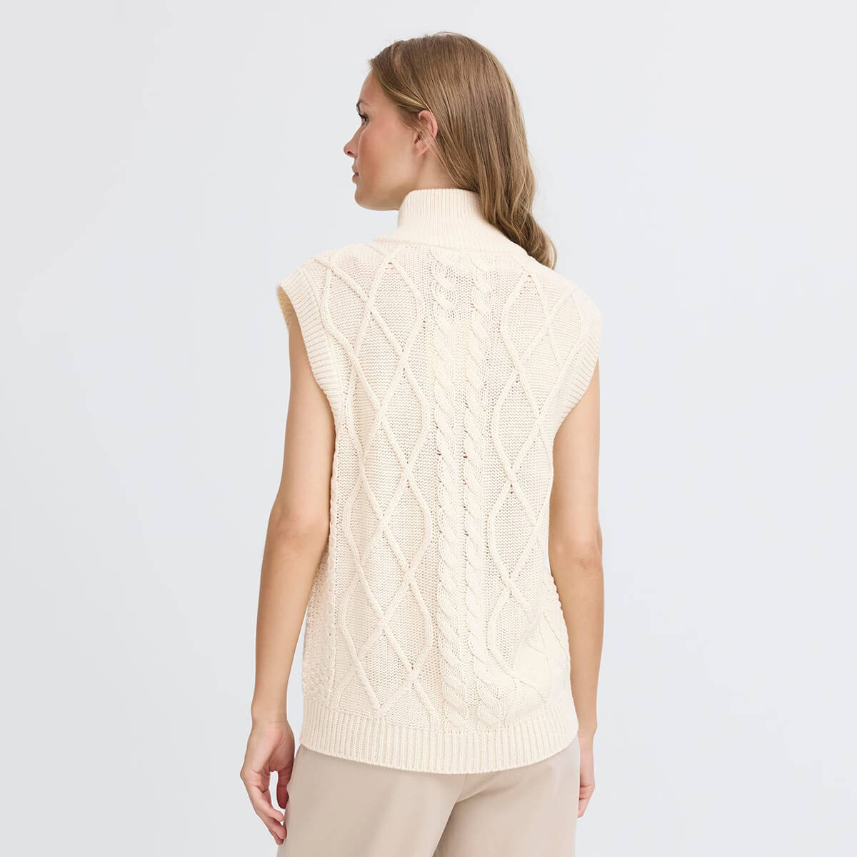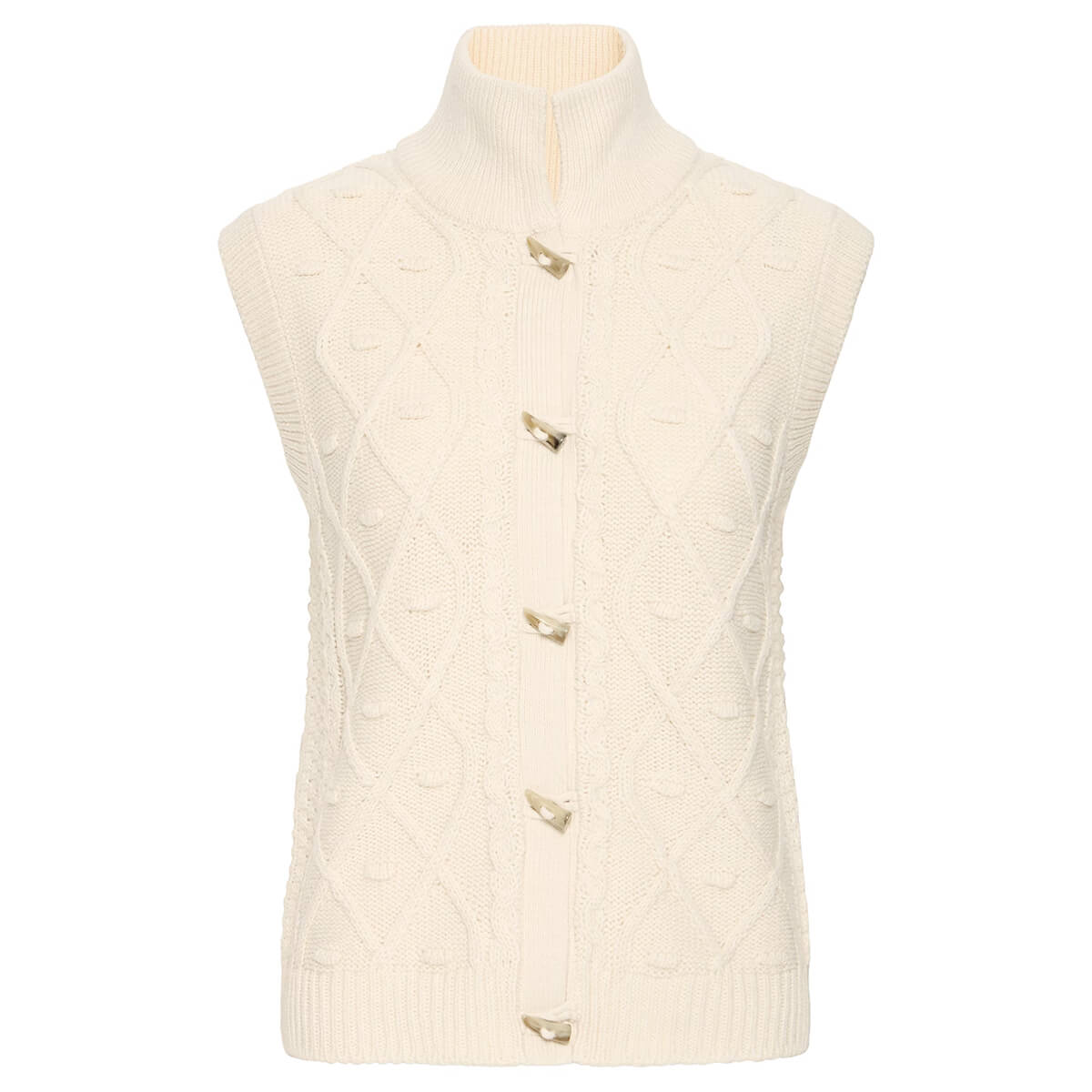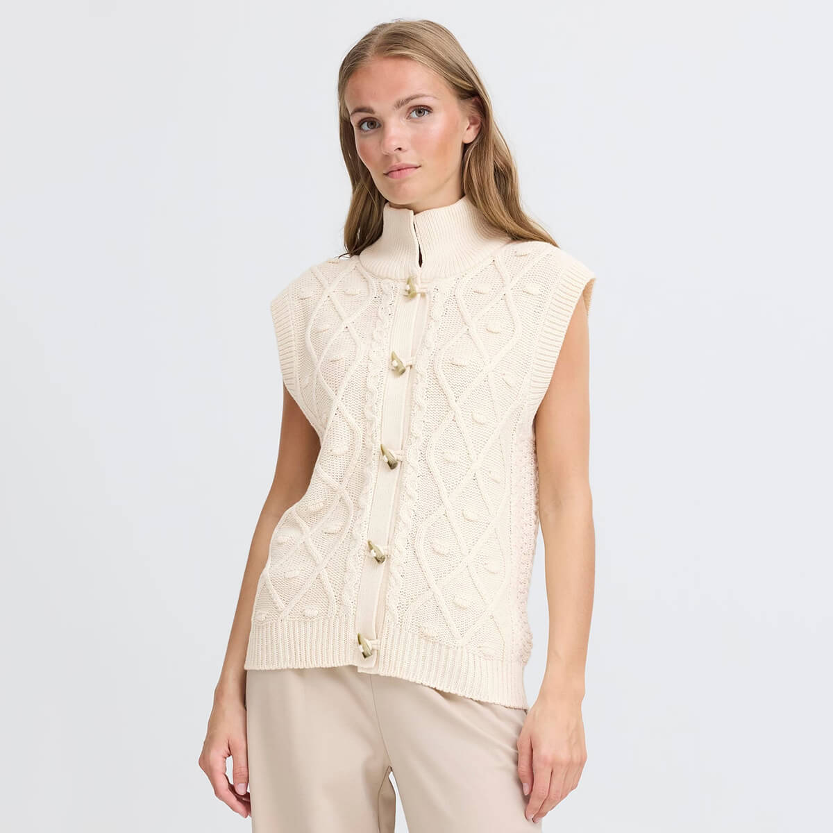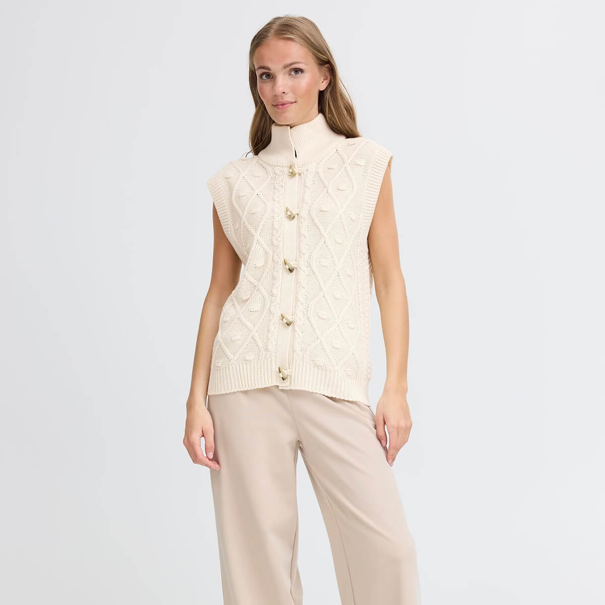 Destan Waistcoat by ICHI. Discover timeless style and comfort with this women’s knitted vest featuring a high neck, buttoned front, sleeveless cut, and relaxed fit. Ideal for layering, this piece adds texture and ease to a versatile wardrobe.