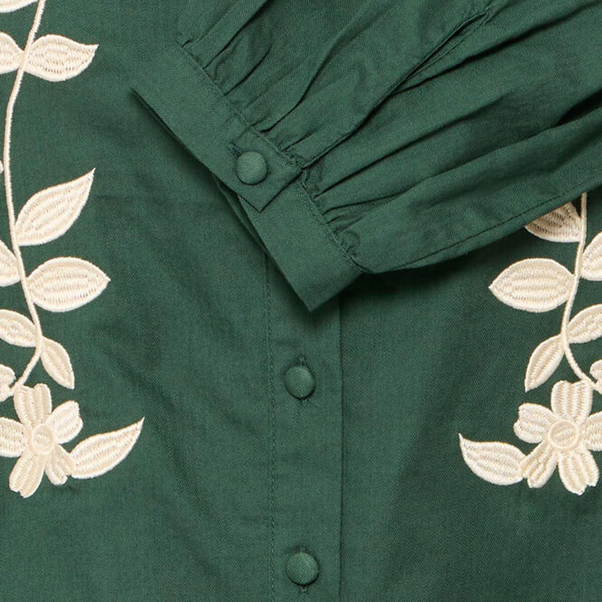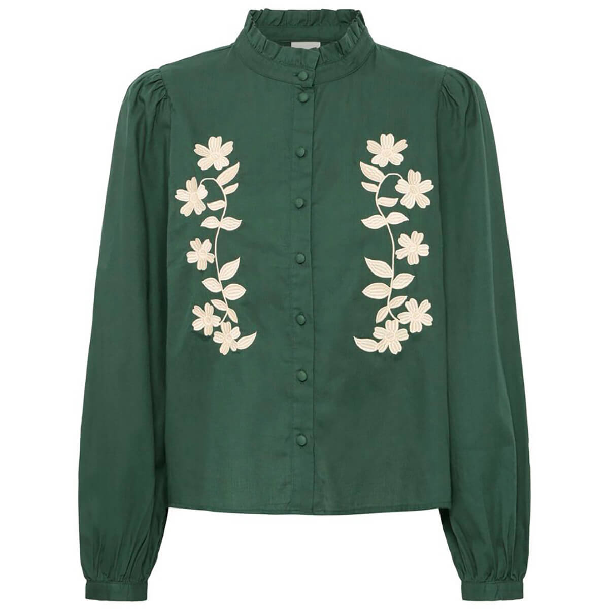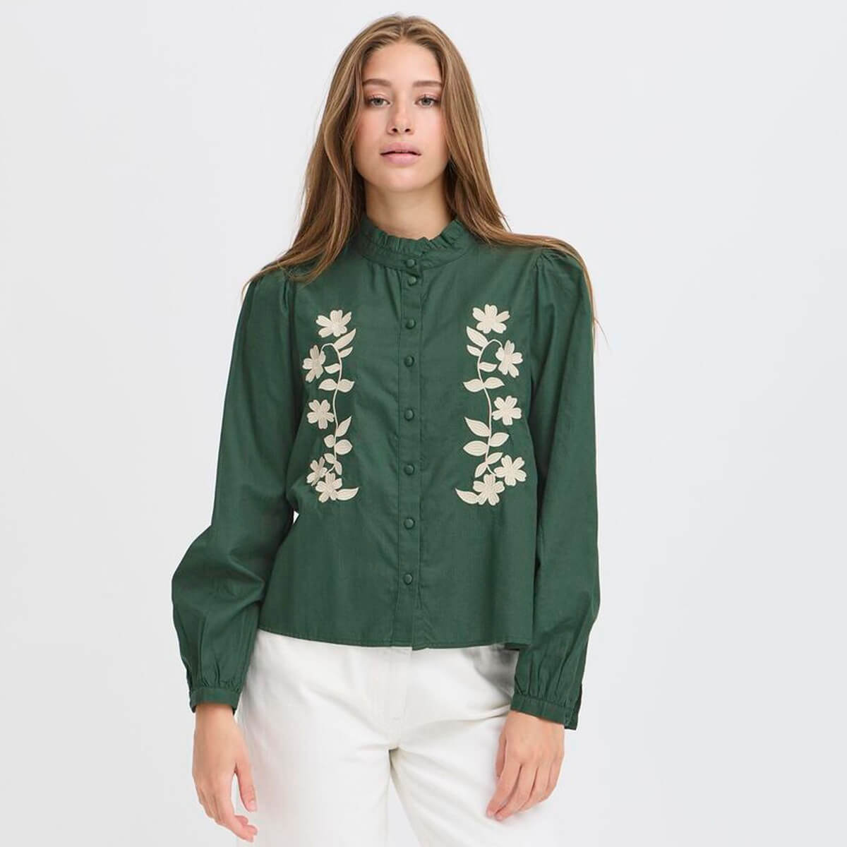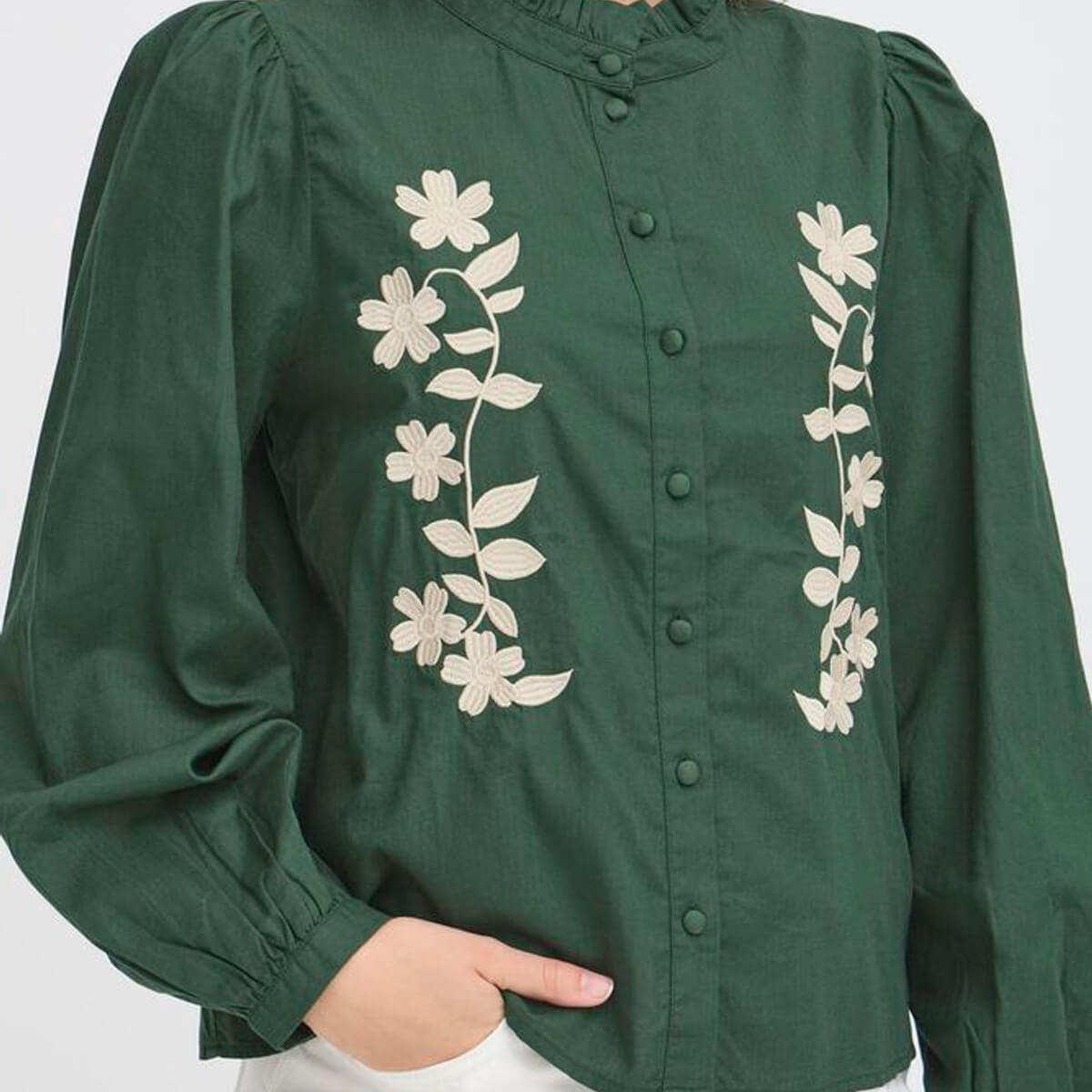 Zarola Shirt by ICHI. Blouse with relaxed fit, featuring a high ruffled neckline, long sleeves with gathered cuffs, and floral embroidered front. Designed for versatile styling and everyday comfort in any wardrobe.