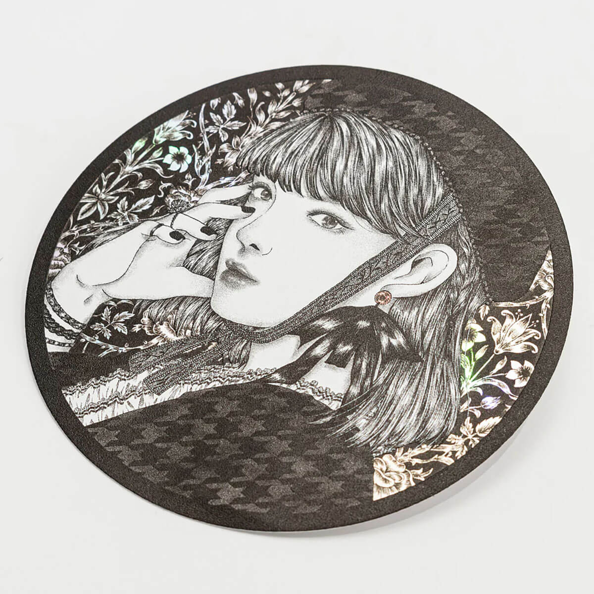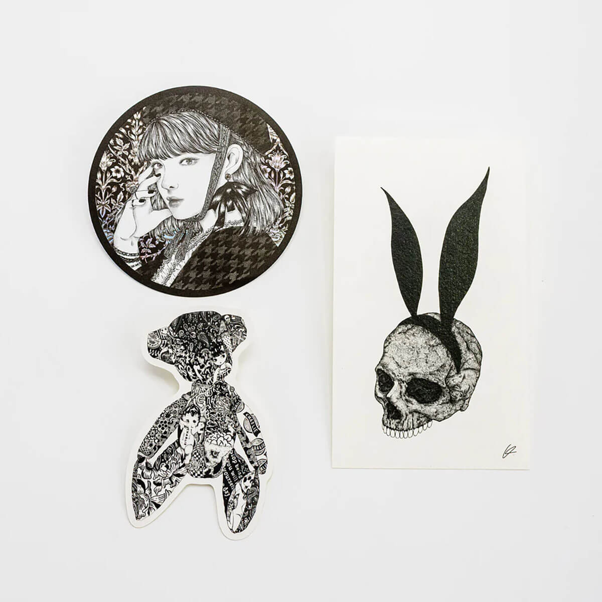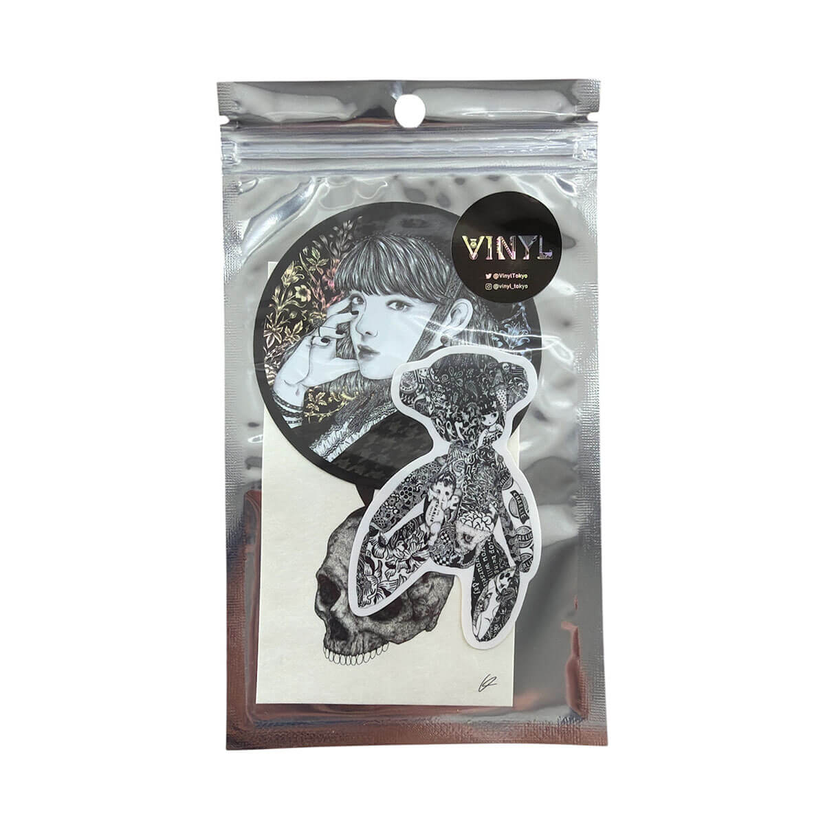 Sticker Set by KenElephant. Vinyl sticker set designed by artist Elly Kawaguchi. This sticker set was created in conjunction with Elly Kawaguchi's solo exhibition "TINY BIT," held in 2022. Each motif uses a different material, recreating the world of Elly Kawaguchi's work. The hologram sticker of a beautiful woman painting features sparkling earrings. Originally from Aomori Prefecture, he worked as an apparel fashion designer before starting his career as a pen artist in 2017. He primarily uses ballpoint pens, a familiar art material, to reflect fleeting expressions and changing emotions in his work. He creates works that are composed of precise lines and dots, and the colours and patterns that are visible to different people allow a single piece to convey a wide variety of sensibilities. In addition to painting delicate portraits, he has recently been creating skull works that incorporate elements of street culture.