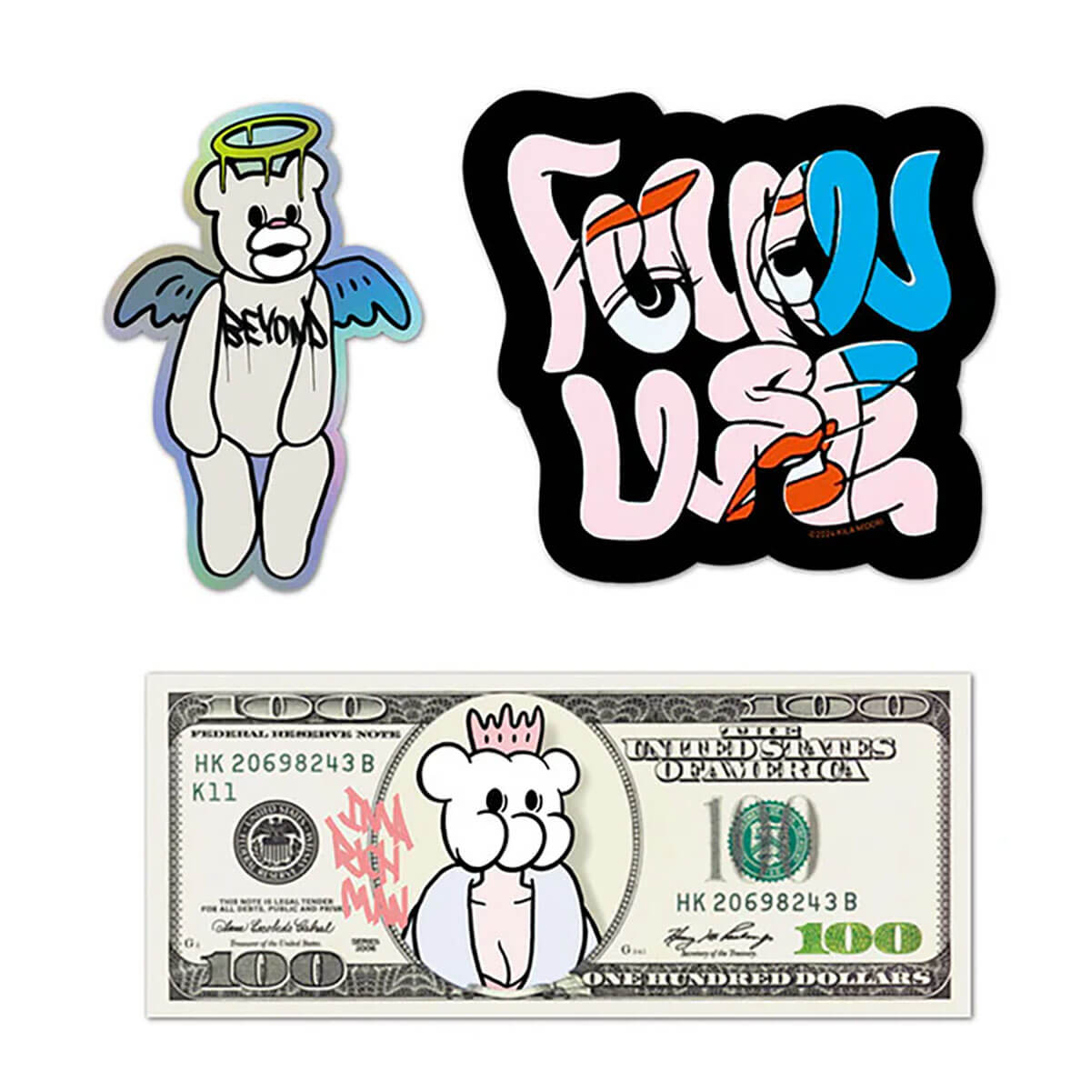 Sticker Set by KenElephant. Vinyl sticker set designed by artist Kila Midori. Kila Midori is a Kobe-based artist and illustrator known for a "dark fantasy" style that blends cute, goofy characters with pastel pop aesthetics and slightly unsettling themes. A graduate of Kobe Design University, she works across various media, including painting, 3D works, and illustrations. She frequently hosts exhibitions, including collaborations with her father, artist Munehiro Yoshimura.
