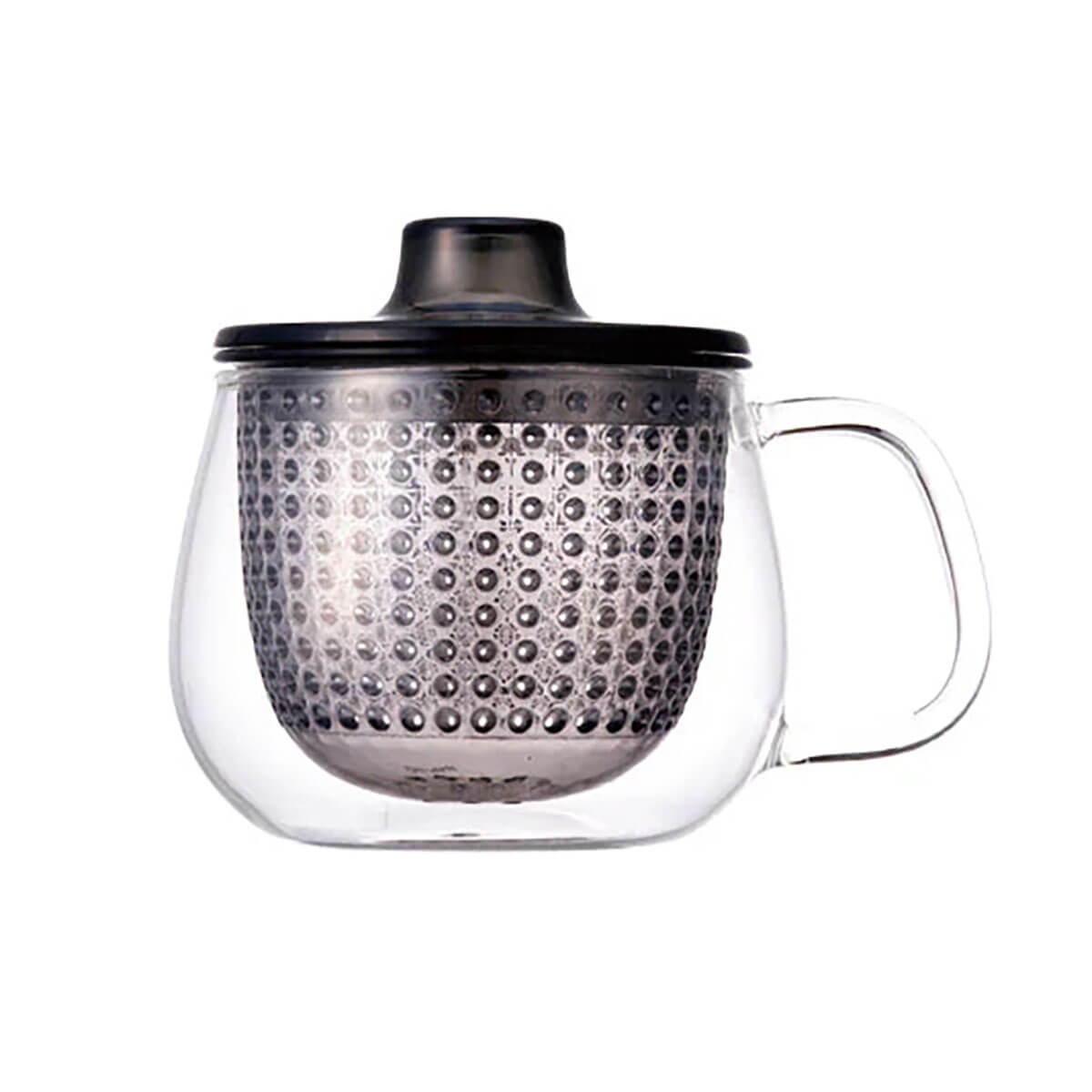 Unitea Unimug by Kinto. Unitea integrates harmoniously into any scene. This glass mug showcases the beauty of the tea inside, letting you observe tea leaves as they bloom. While made of glass, the large arched design of the handle lets you grip firmly and comfortably.
