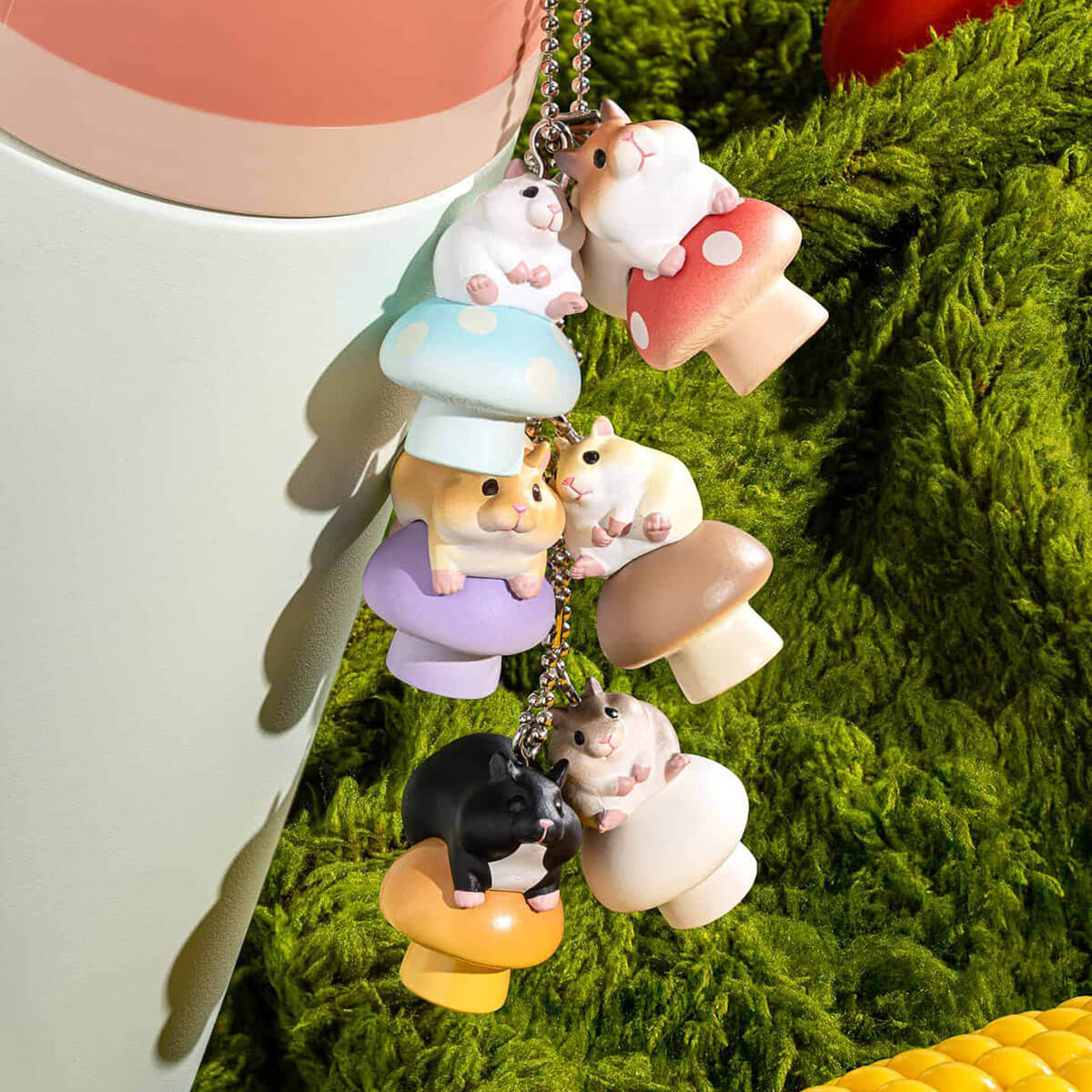 Hamster On Mushroom Blind Box by Kitan Club. Bring a touch of whimsy to your collection with these irresistibly cute Hamster on Mushroom figures! Each figure features a chubby little hamster comfortably perched on a delightfully colourful mushroom cap, combining adorable charm with playful design. This series includes six unique variations, each with different hamster colours and mushroom styles. Whether it’s the shy white hamster on a blue polka-dot mushroom or the curious black-and-white buddy on a golden cap, each figure is full of character and detail.
