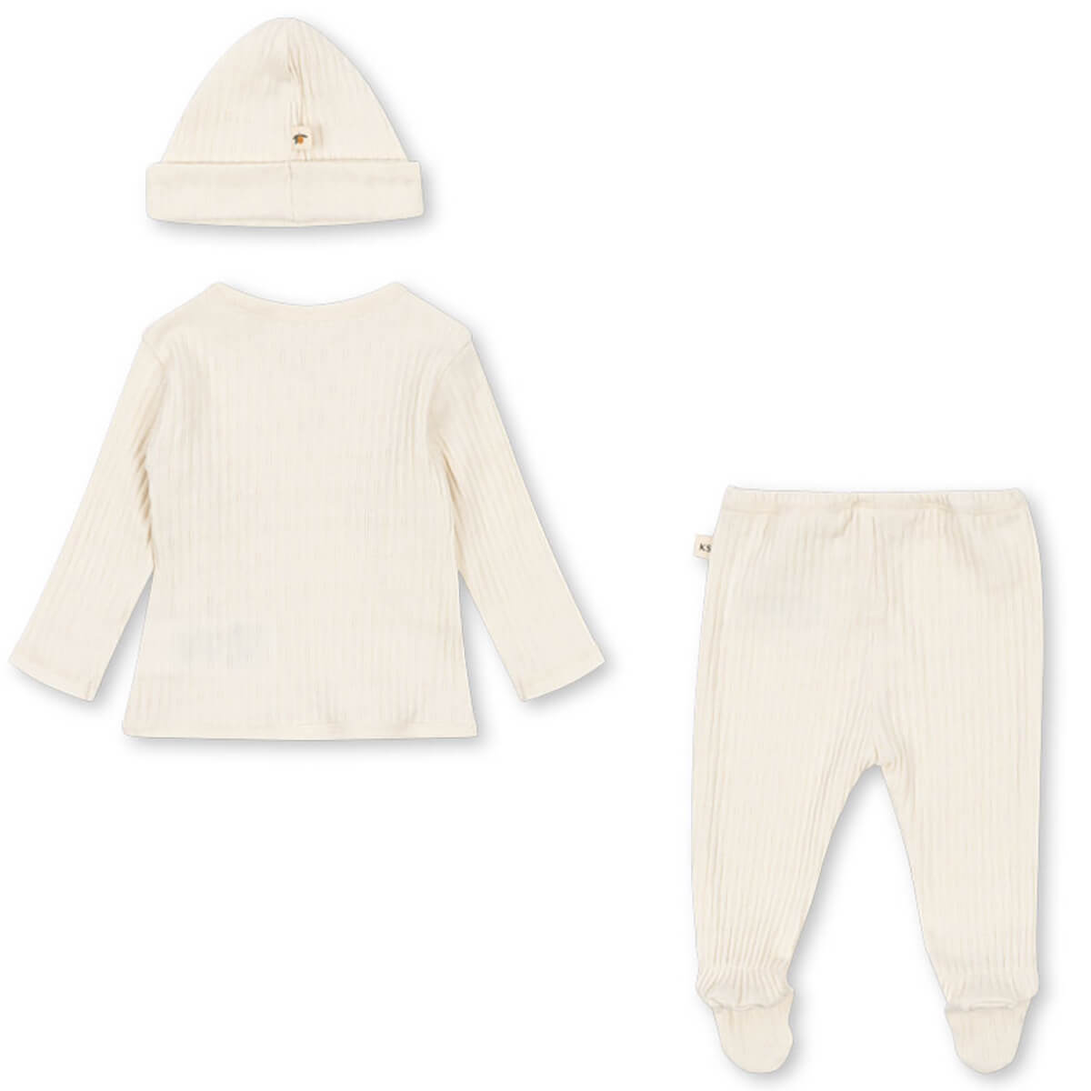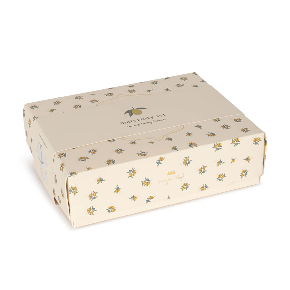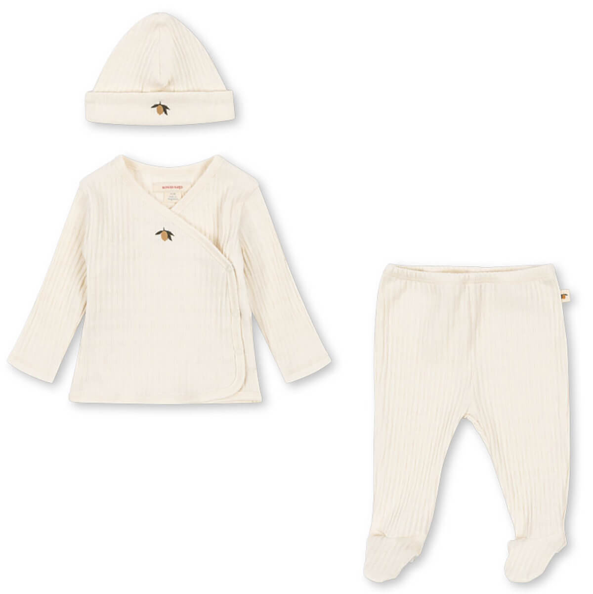 Nia Take Me Home Set by Konges Slojd. The perfect gift for new parents: A thoughtful maternity package with a soft wrap cardigan, footed pants, a baby hat, and a soft snuggle bunny.