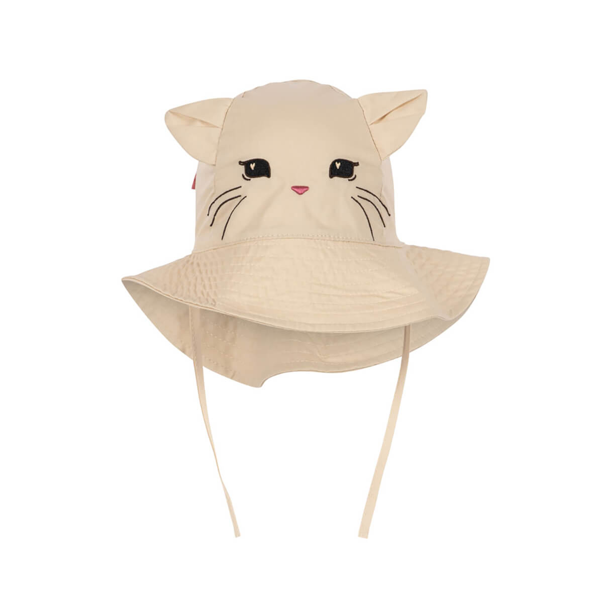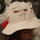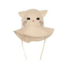 Verbena Bow Kitty Baby Sun Hat by Konges Sløjd. Sun hat with a cat design, cat ears on the top and a bow in the back. Designed with strings that tie under the chin.