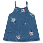 Magot Strap Dress by Konges Sløjd. Denim strap dress with embroidered sequin ice cream desserts. Designed with a flattering straight silhouette that is perfect for wearing alone or for layering with a tee or blouse underneath.