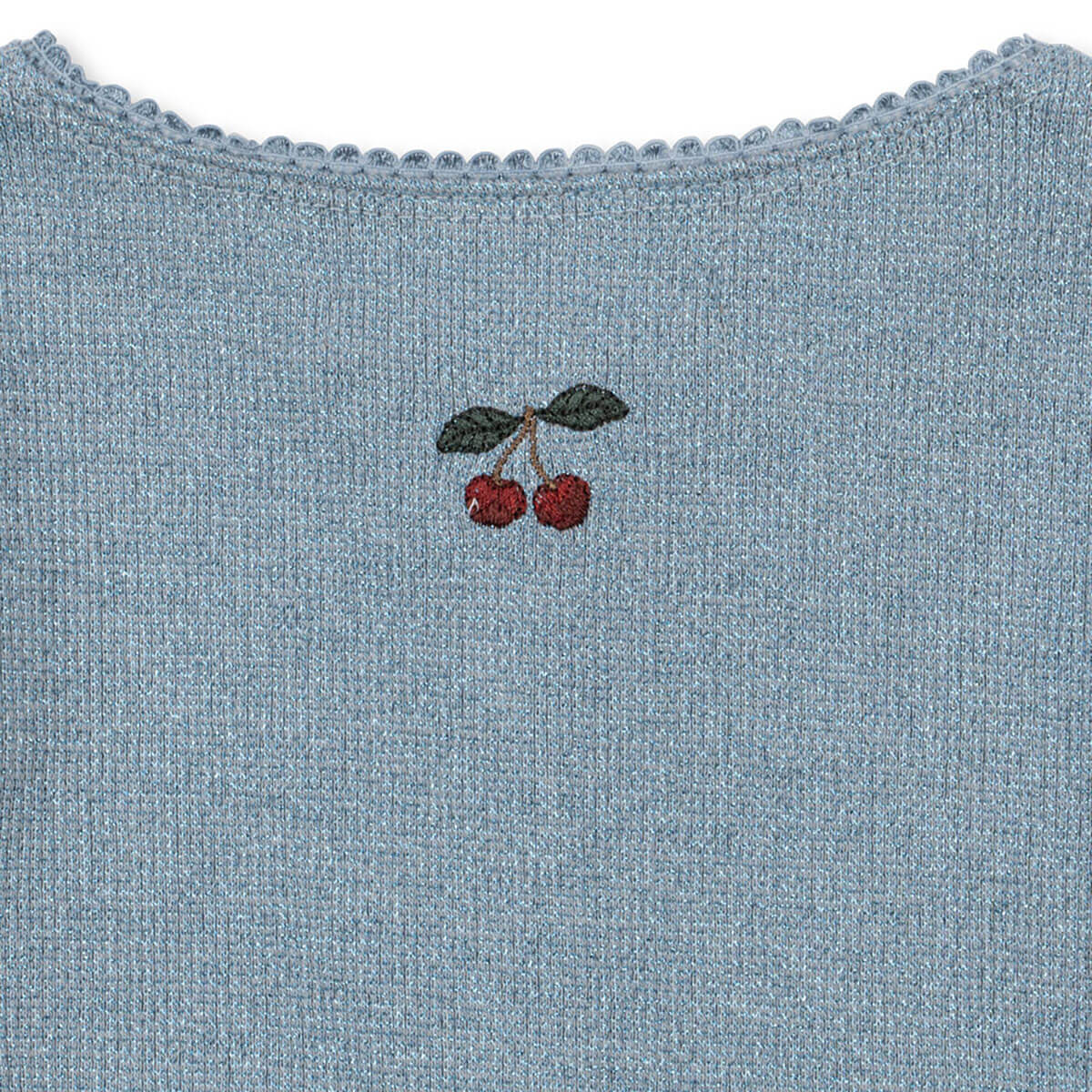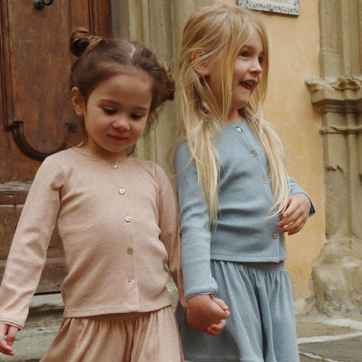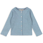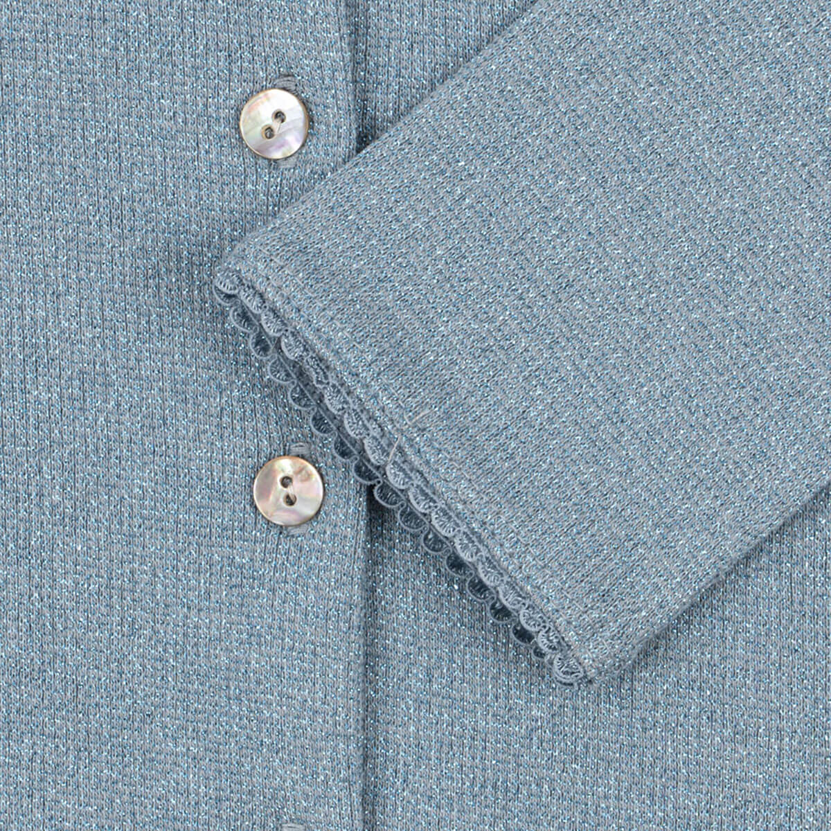 Roli Cardigan by Konges Sløjd. Soft and stretchy rib cardigan designed to be worn alone as a blouse or as a classic cardigan. Roli is a perfect everyday piece made from an organic cotton blend that is woven with a little bit of lurex for a little bit of shine. Designed with decorative picot edges around the neck line.