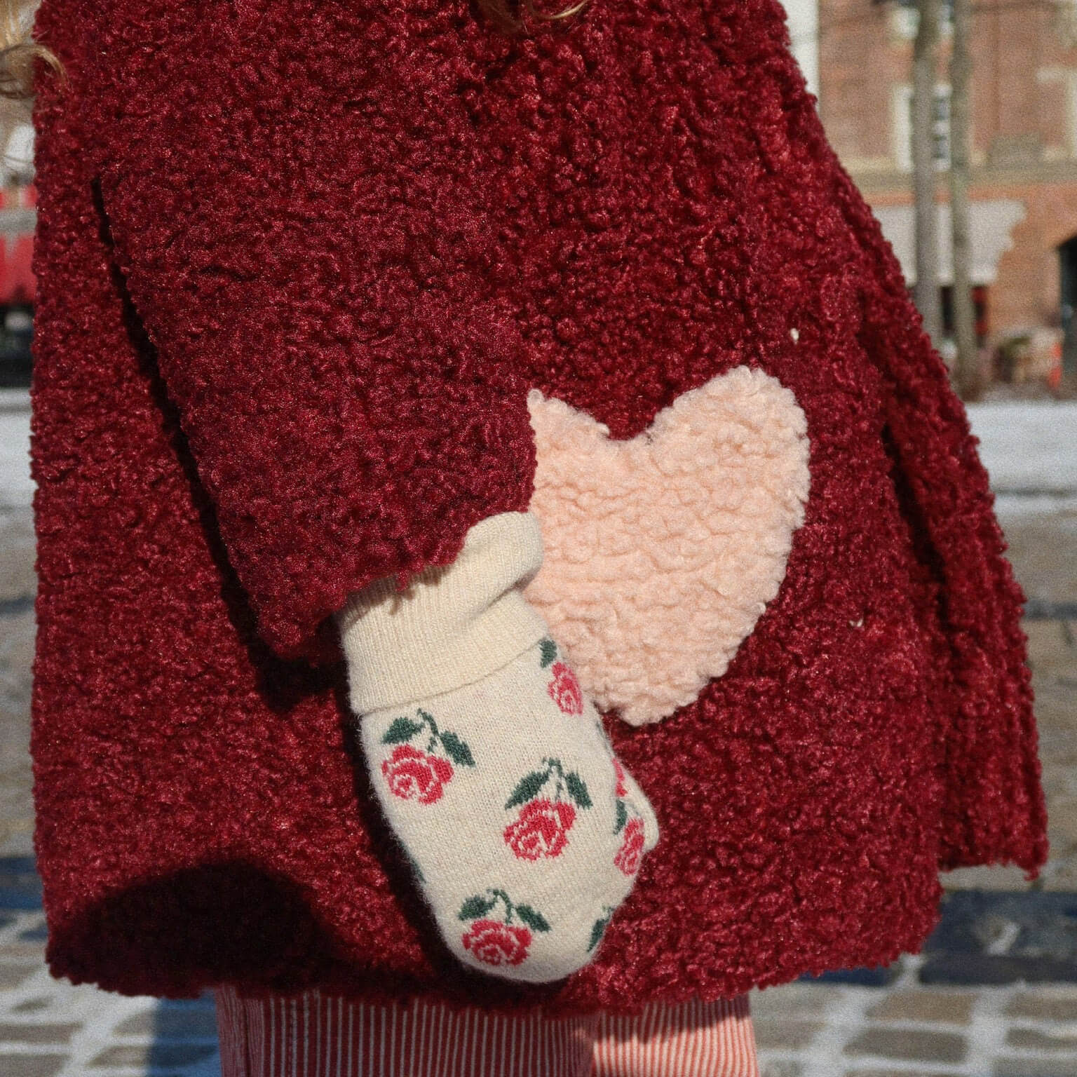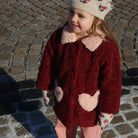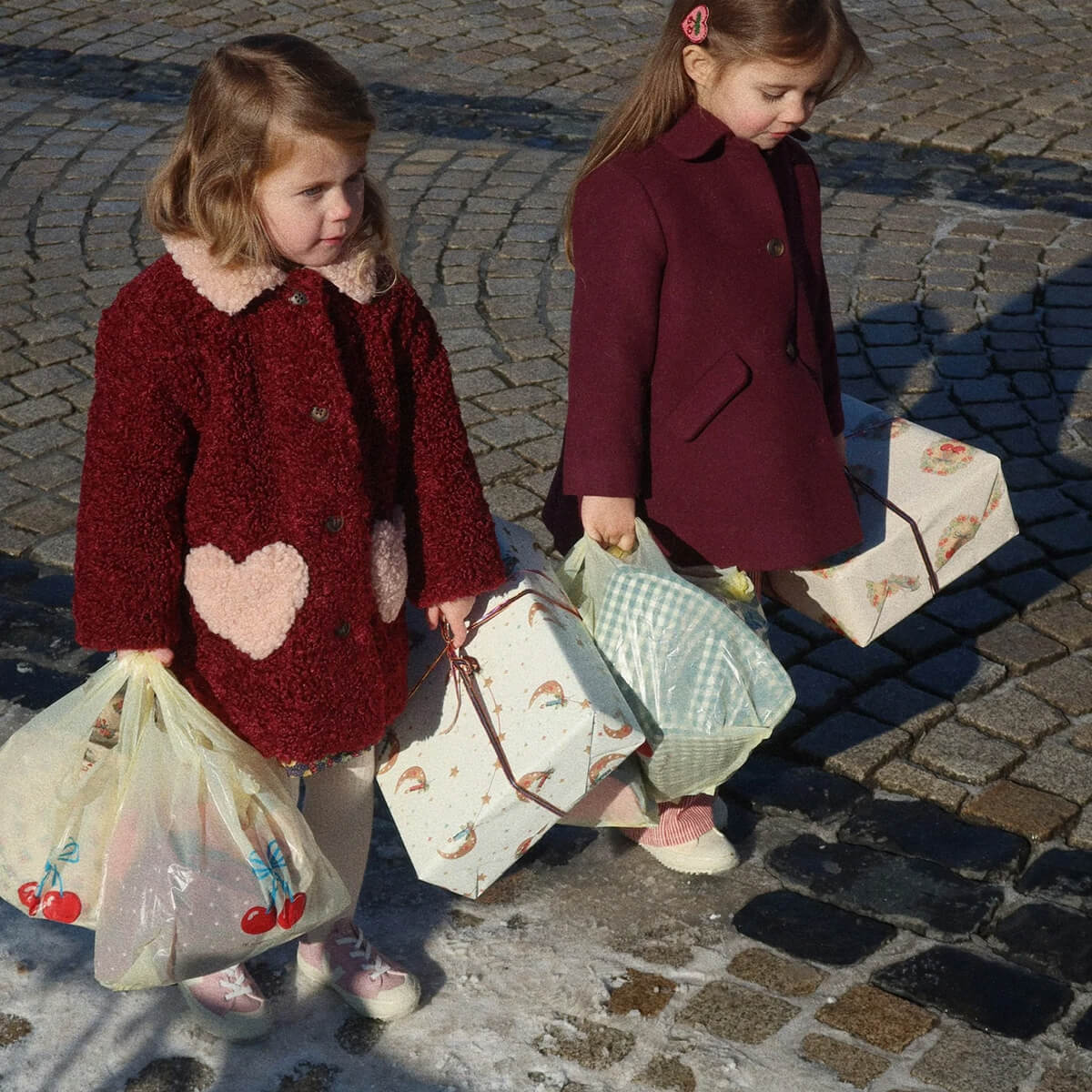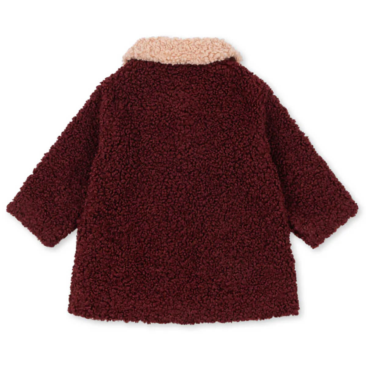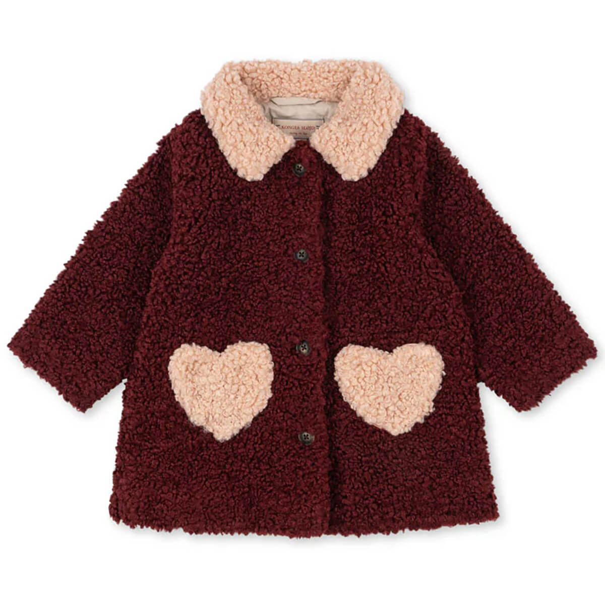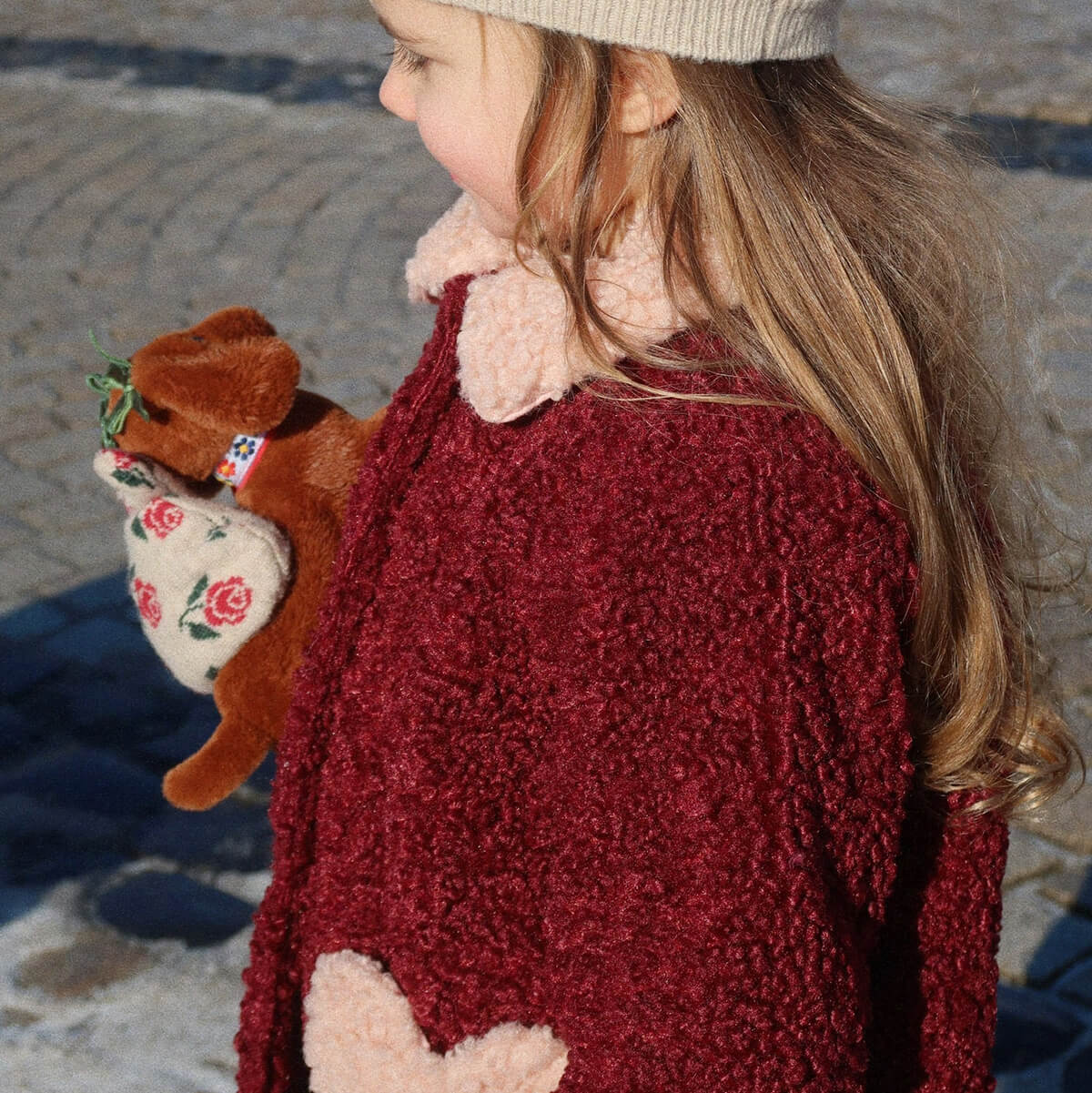 Calin Coat by Konges Sløjd. Soft and fluffy coat with a rounded collar, heart-shaped front pockets, and elegant horn buttons in front. Designed with a gentle A-shape silhouette that is flattering and easy to wear.