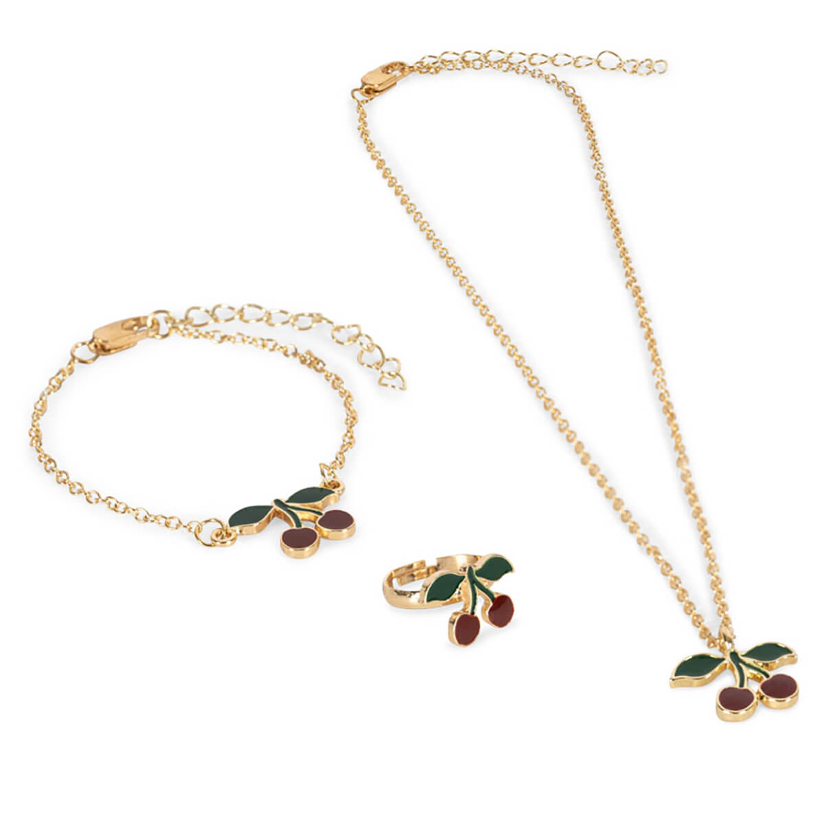Cherry Jewellery Set by Konges Sløjd. The sweetest little motif necklace, bracelet and adjustable ring.