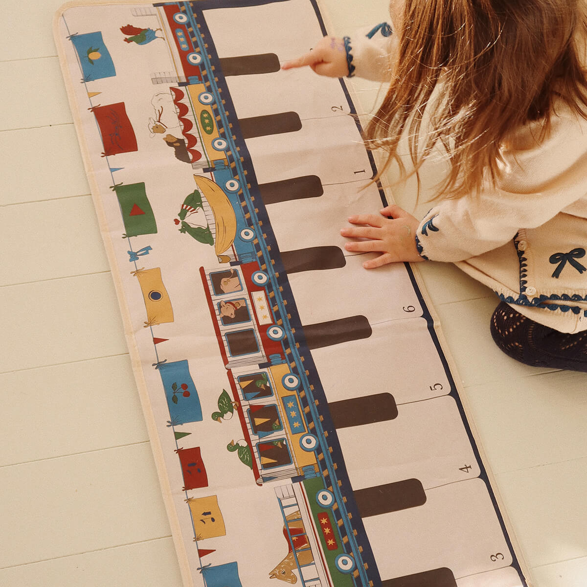Floor Piano by Konges Sløjd. Musical 'blanket' to place on the floor. Step on or press the buttons to make sounds. Includes classic piano sounds when you press the keys, as well as different demo melodies, interaction learning games with animal names and sounds, and a recording button to save your own melodies.