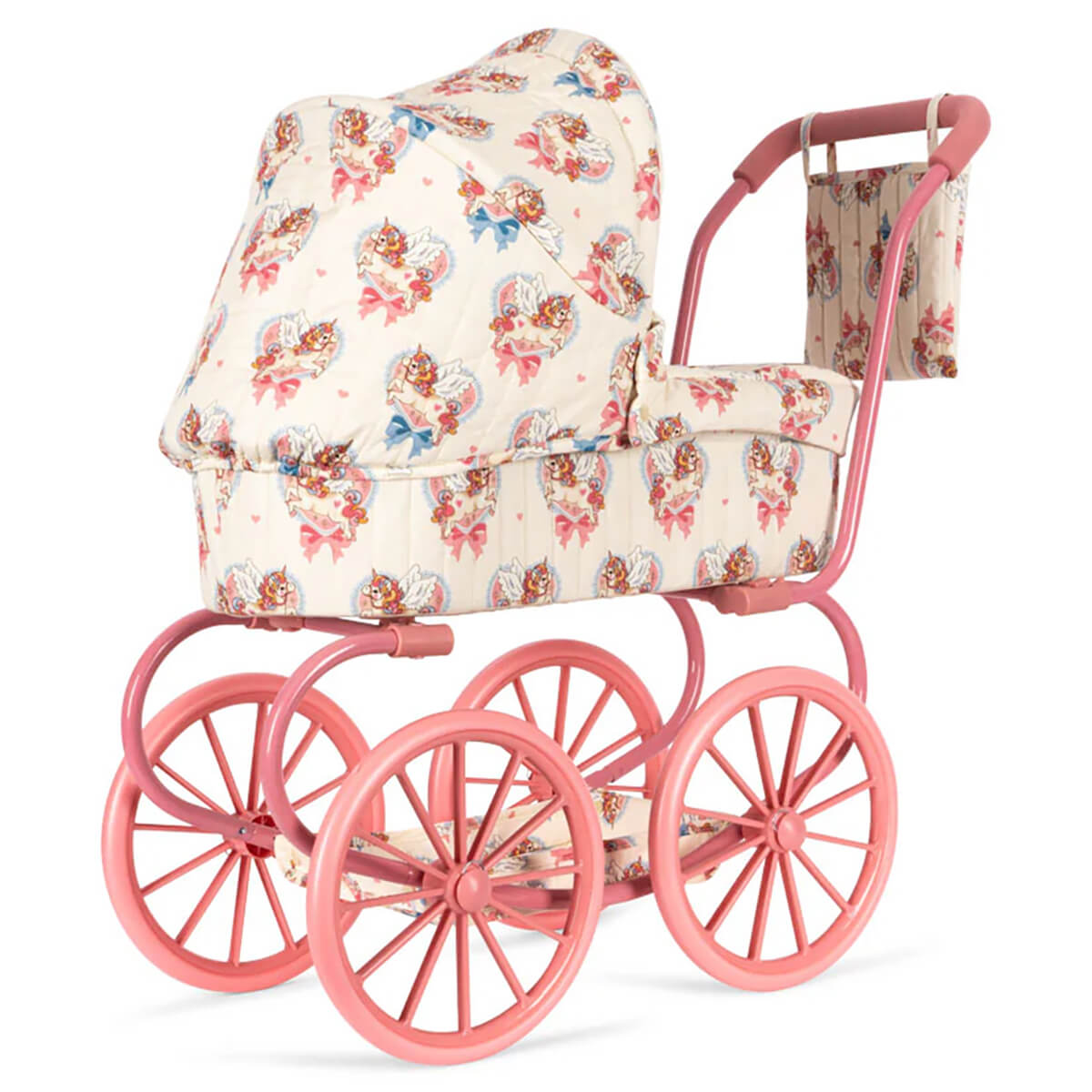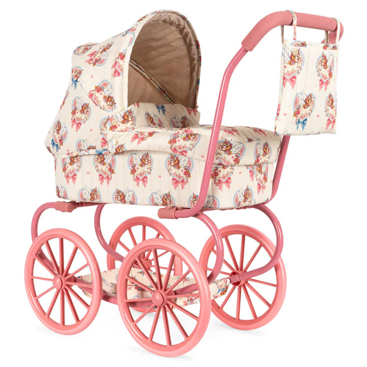 Minnie Doll Pram by Konges Sløjd. A smaller version of the classic vintage style doll pram. Designed with four large wheels that make it easy and stable to walk with, quilted fabric, and delicate scallop edges. The doll pram includes a cushioned storage basket under the lift. The frame is made of metal with spongy soft handles. Comes fully assembled and is easy to fold and store.
