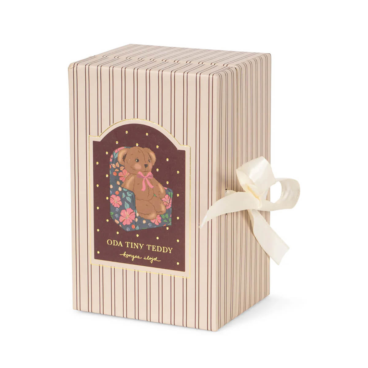 Oda The Tiny Teddy by Konges Sløjd. Sweet little miniature teddy. Oda comes in a small box for cute storage and even brings her own vintage-inspired armchair to play with.