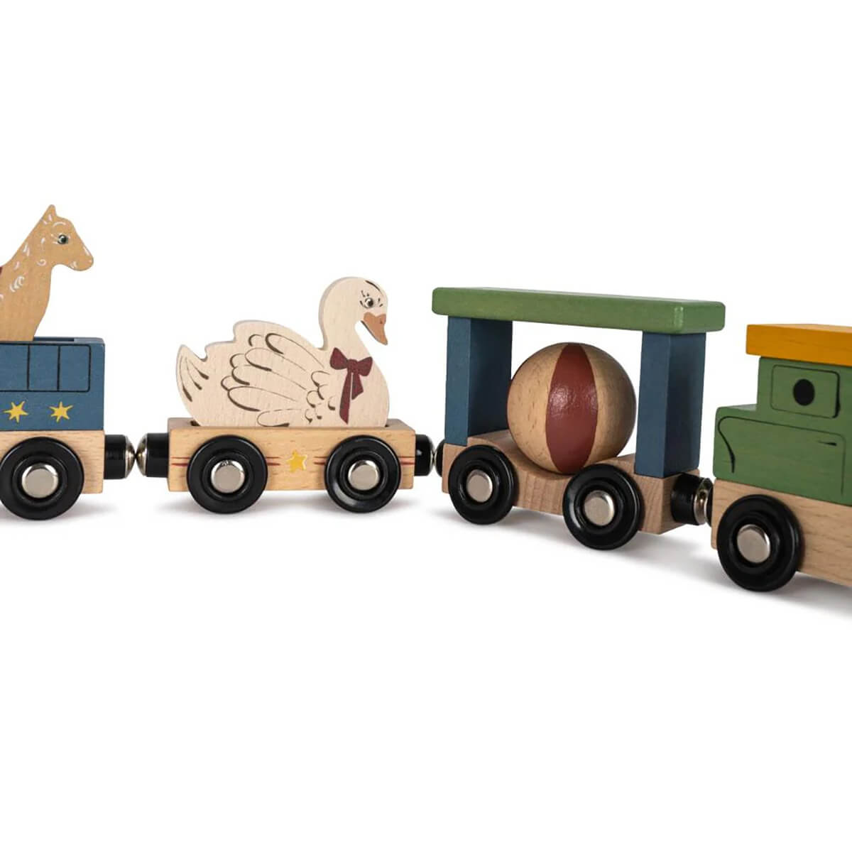 Animal Train by Konges Sløjd. Wooden train with six colourful train cars and four animals. The train is magnetically assembled.