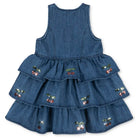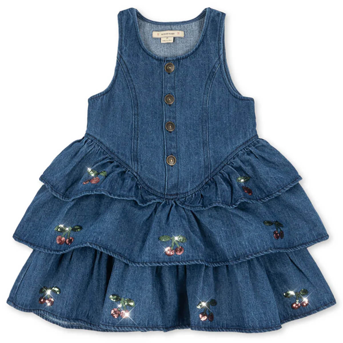 Elba Dress by Konges Sløjd. Denim dress with a tiered skirt and embroidered sequin cherries. Designed with a round neckline and button closure.