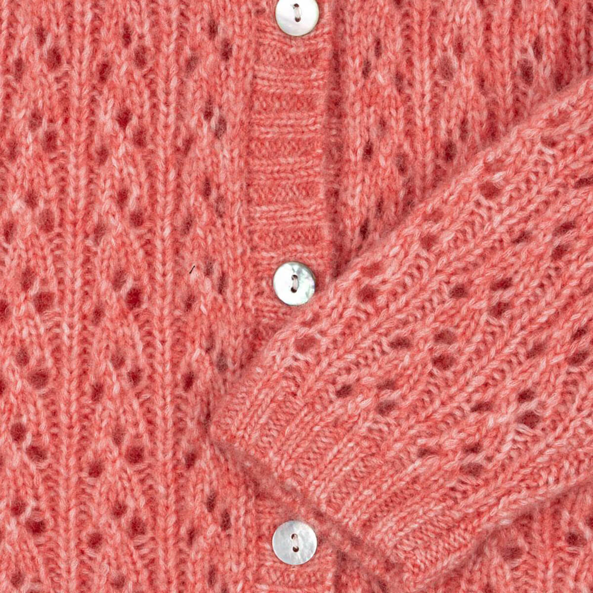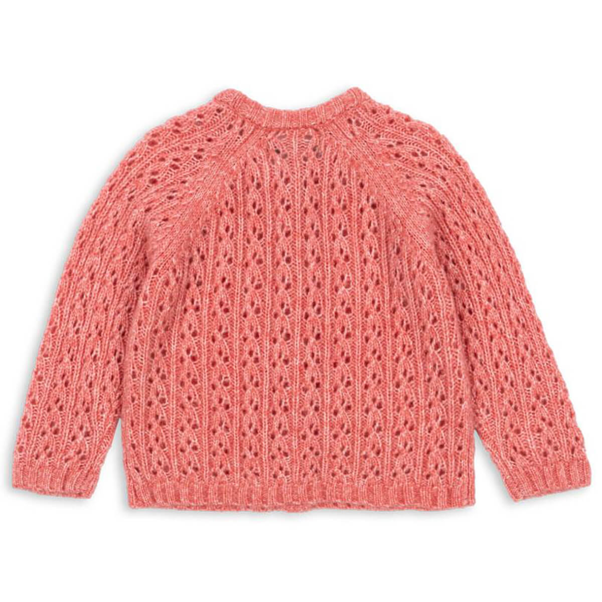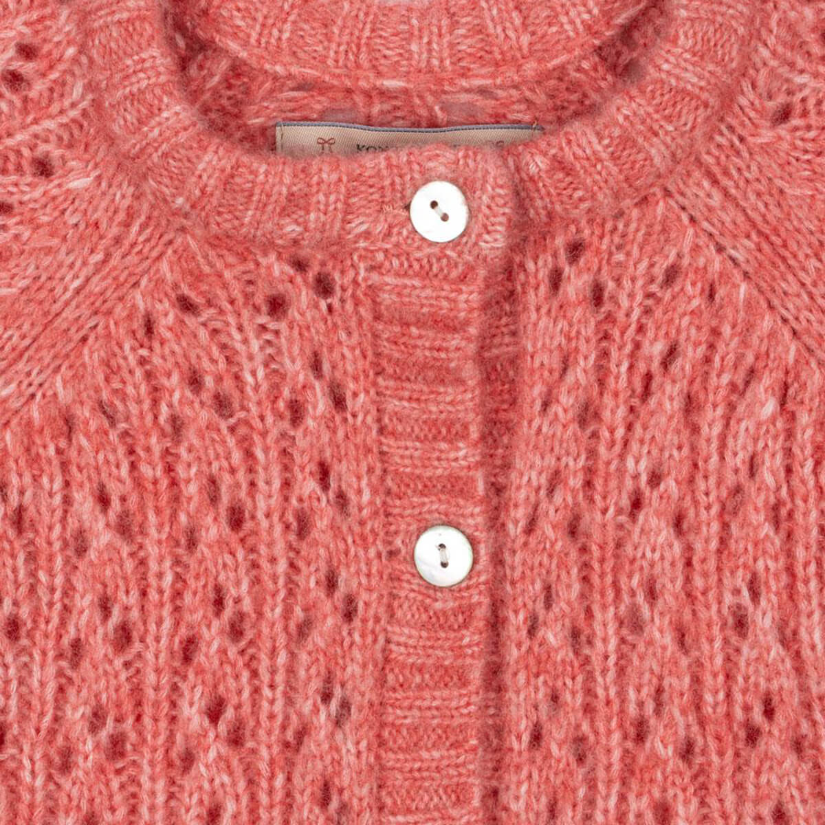 Isa Cardigan by Konges Slojd. Soft and fluffy cardigan in a warm wool blend. Knitted in a structured hole knit pattern and finished with mother of pearl buttons in front.
