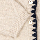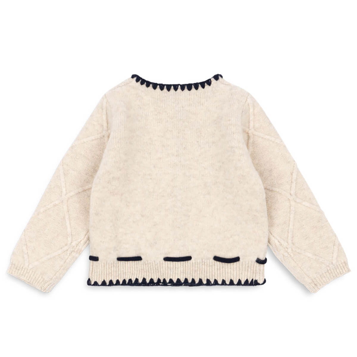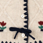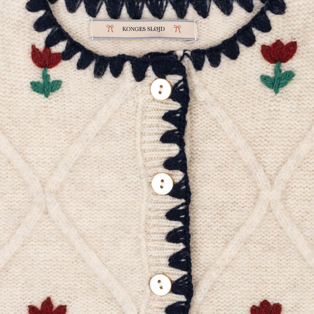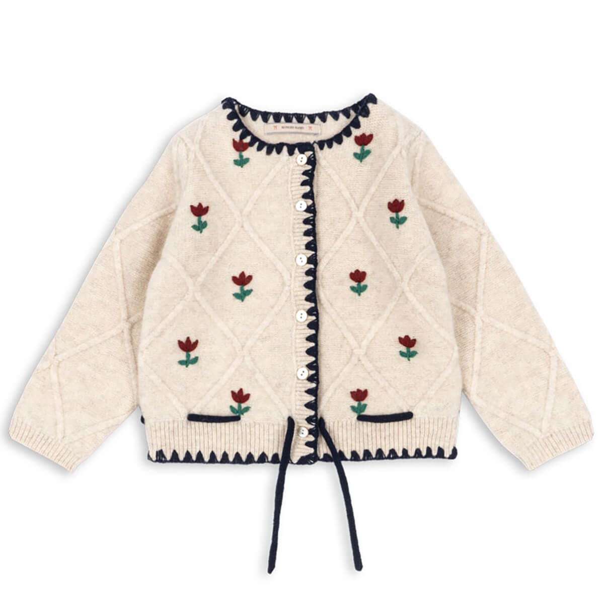 Iska Cardigan by Konges Sløjd. Knitted wool cardigan with intricate detailing. Made with delicate flower embroidery, contrast coloured edges, and full button opening in front. Finished with a drawstring detail at the bottom that ties in front.