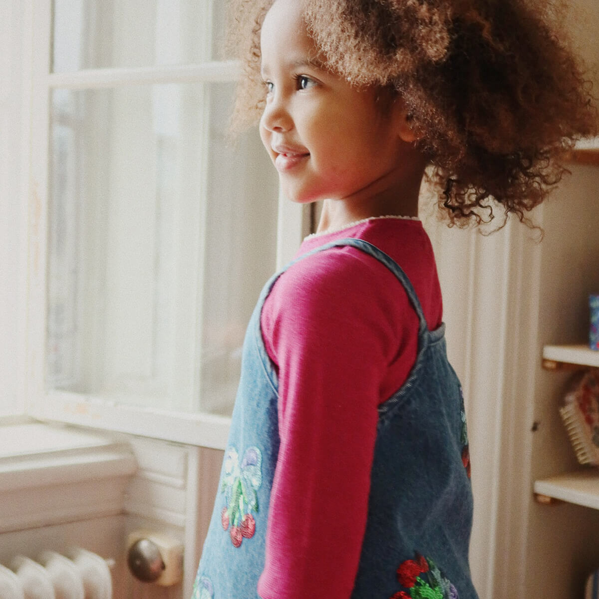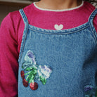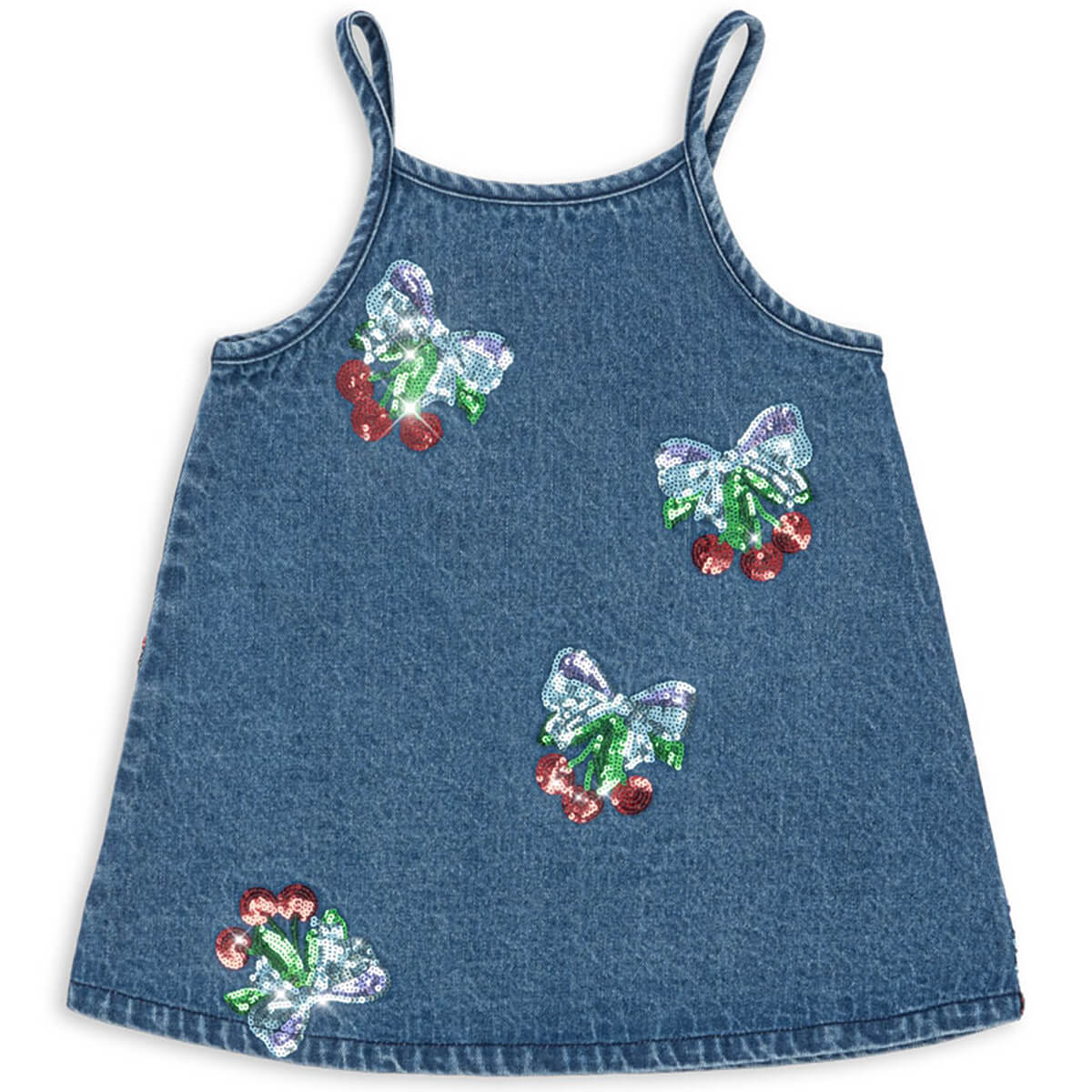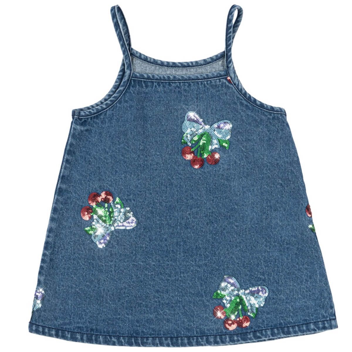 Magot Dress by Konges Sløjd. Denim strap dress with embroidered sequin cherry bows.