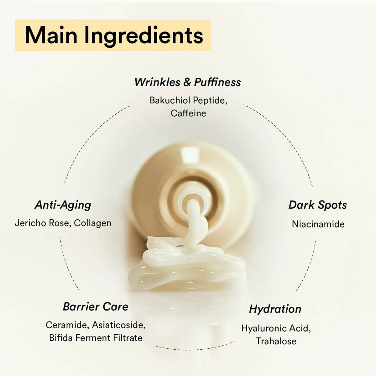 Ingredients: Water, Glycerin, Niacinamide, Octyldodecanol, Caprylyl Methicone, Caprylic/Capric Triglyceride, Pentaerythrityl Tetraethylhexanoate, Pentylene Glycol, Polyglyceryl-3 Methylglucose Distearate, Behenyl Alcohol, Methylpropanediol, Polymethylsilsesquioxane, 1,2-Hexanediol, Anastatica Hierochuntica Extract, Collagen Extract, Panthenol, Macadamia Integrifolia Seed Oil, Mangifera Indica (Mango) Seed Butter, Lactobacillus Ferment, Hippophae Rhamnoides Oil, Sodium Hyaluronate, Macadamia Ternifolia Seed Oil, Bifida Ferment Filtrate, Cetearyl Olivate, Hydroxyethyl Acrylate/Sodium Acryloyldimethyl Taurate Copolymer, Sorbitan Olivate, Glyceryl Stearate, Polyglyceryl-3 Distearate, Ammonium Acryloyldimethyltaurate / VP Copolymer, Bis-Diglyceryl Polyacyladipate-2, Caprylyl Glycol, Cetearyl Glucoside, Squalane, Ethylhexylglycerin, Dipotassium Glycyrrhizate, Sorbitan Isostearate, Adenosine, Allantoin, Glyceryl Stearate Citrate, Trisodium Ethylenediamine Disuccinate, Hydrogenated Lecithin, Ceramide NP, Tocopherol, Bakuchiol, Trehalose, Dipropylene Glycol, Butylene Glycol, Polyglyceryl-10 Laurate, Phosphatidylcholine, Asiaticoside, Phytosphingosine, Asiatic Acid, Glycolipids, Madecassic Acid, Palmitoyl Tripeptide-5, Sorbitol, Cetearyl Alcohol, Stearyl Alcohol, Xanthan Gum, Caffeine. Ingredients list offered as a guide only. For the most complete and up-to-date list of ingredients, please refer to product packaging.