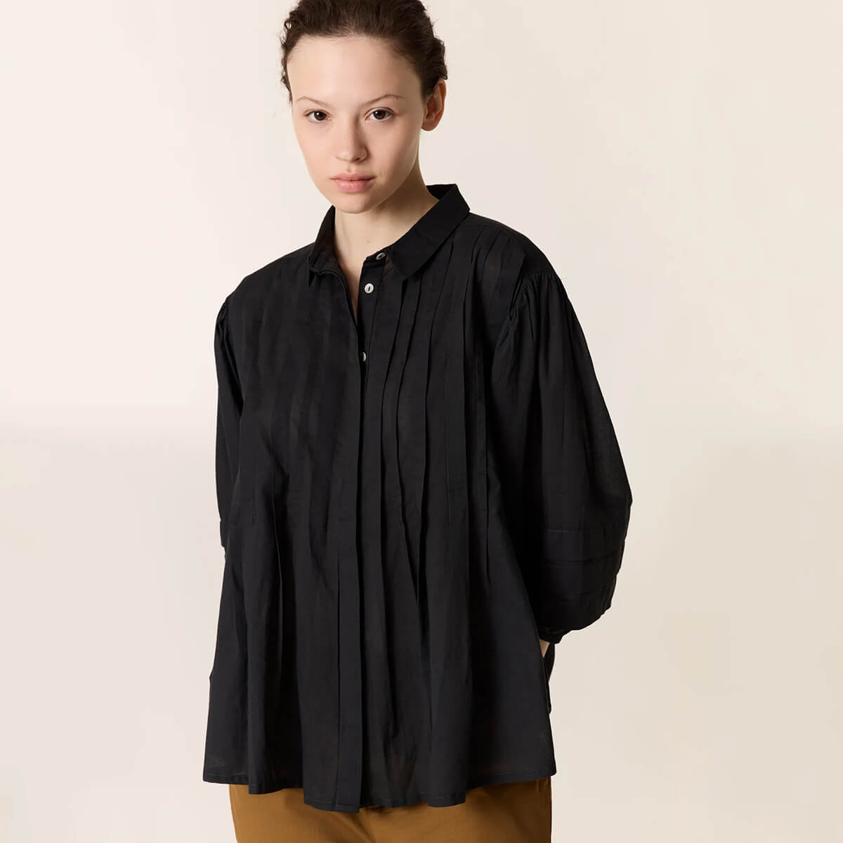 Chimi Shirt by Leon & Harper. An easy to wear pleated shirt with 3/4 length sleeves. Its pleated details and flowing cut make it a must-have for causal and elegant silhouettes.