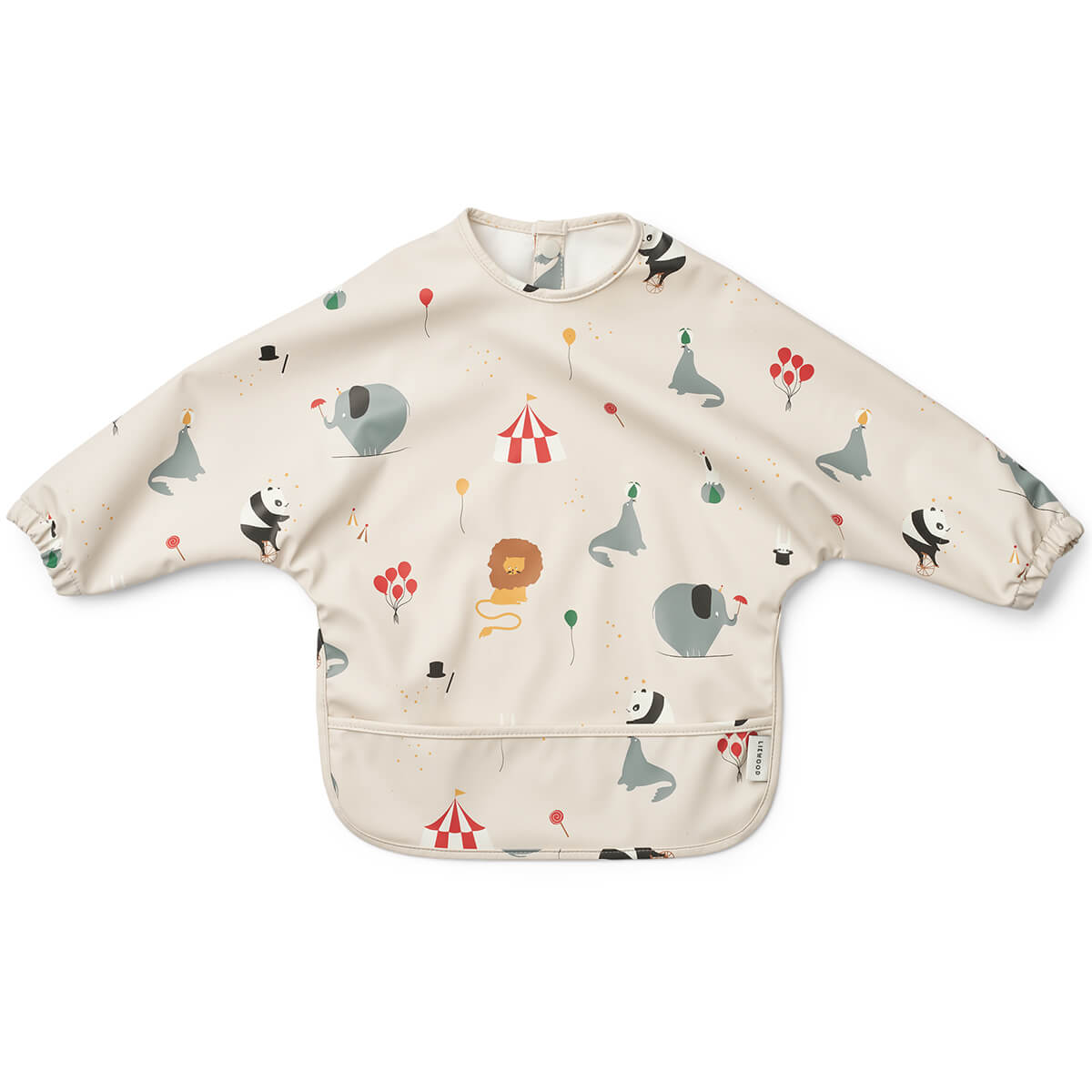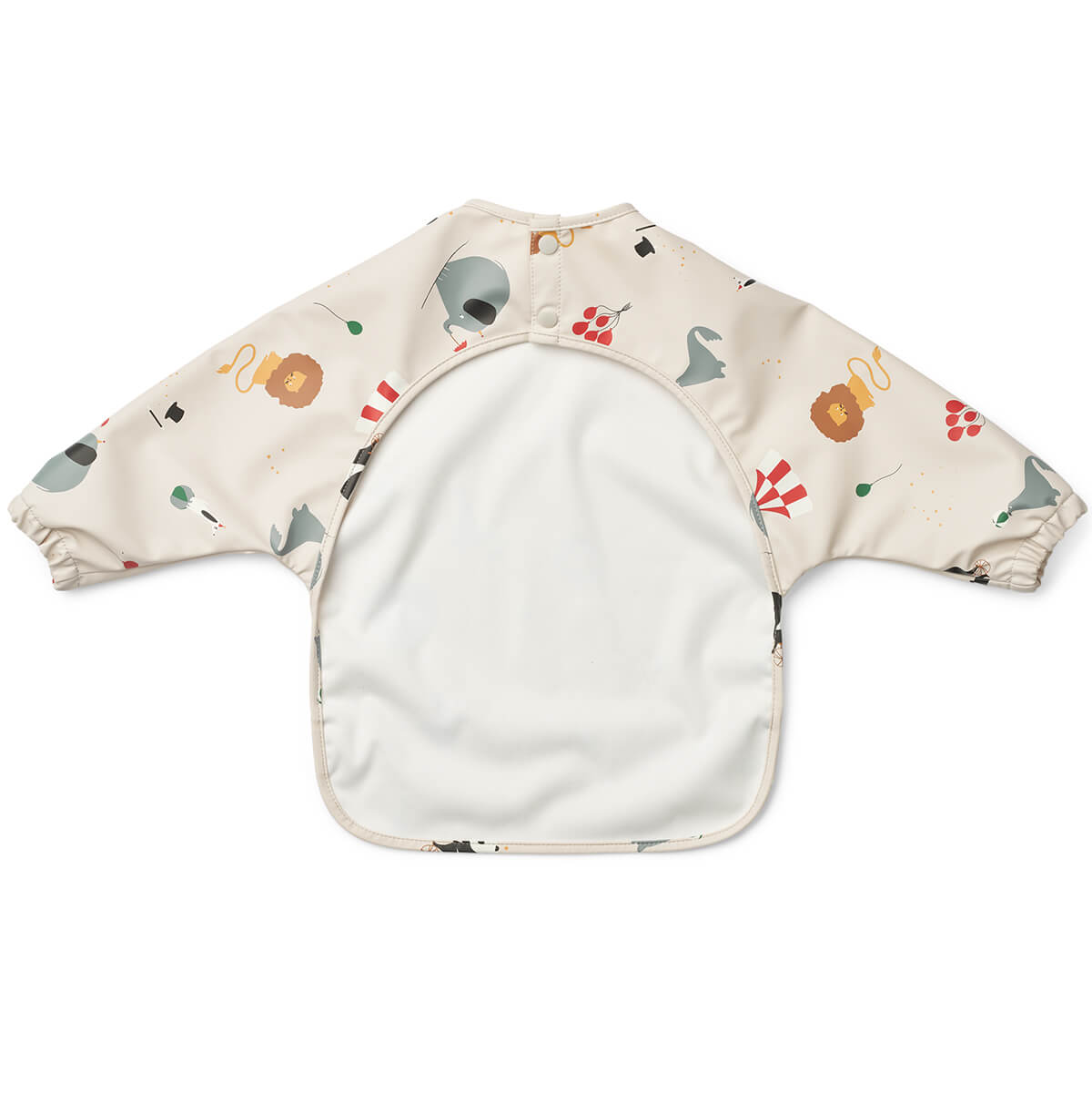 Merle printed cape bib by Liewood. A practical and water-repellent bib, lightweight and comfortable to wear with sleeves and a catch-all pocket at the bottom in order to protect the floor and clothes further. The bib can easily be wiped clean but also goes in the washing machine.