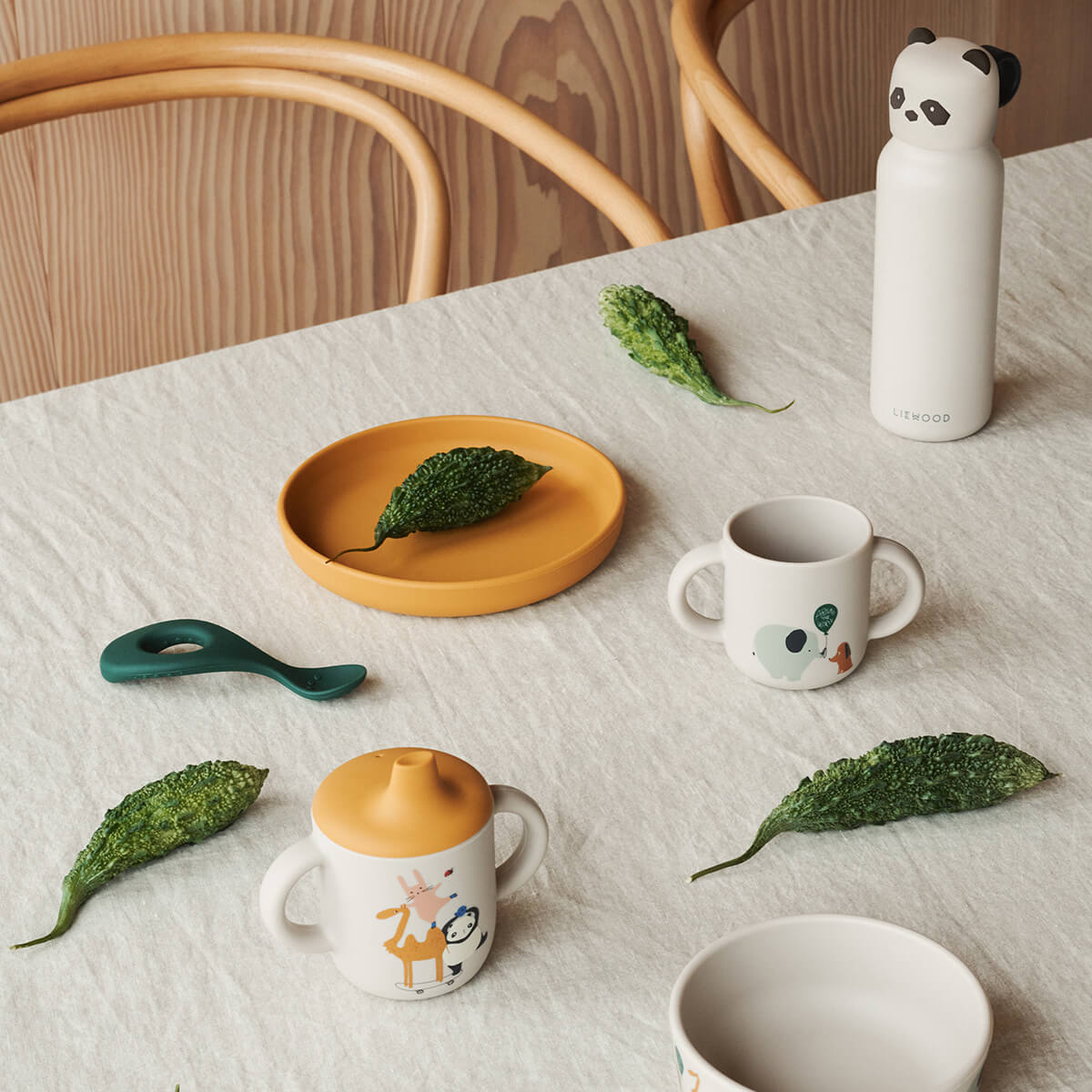 Neil sippy cup by Liewood. Perfect design for mastering the skills to drink. The “no-spill” cup has a removable lid with a small spout and smooth handles. The handles ensure a tight grip and allow the child to practice holding and tilting and prepare for using an open cup.