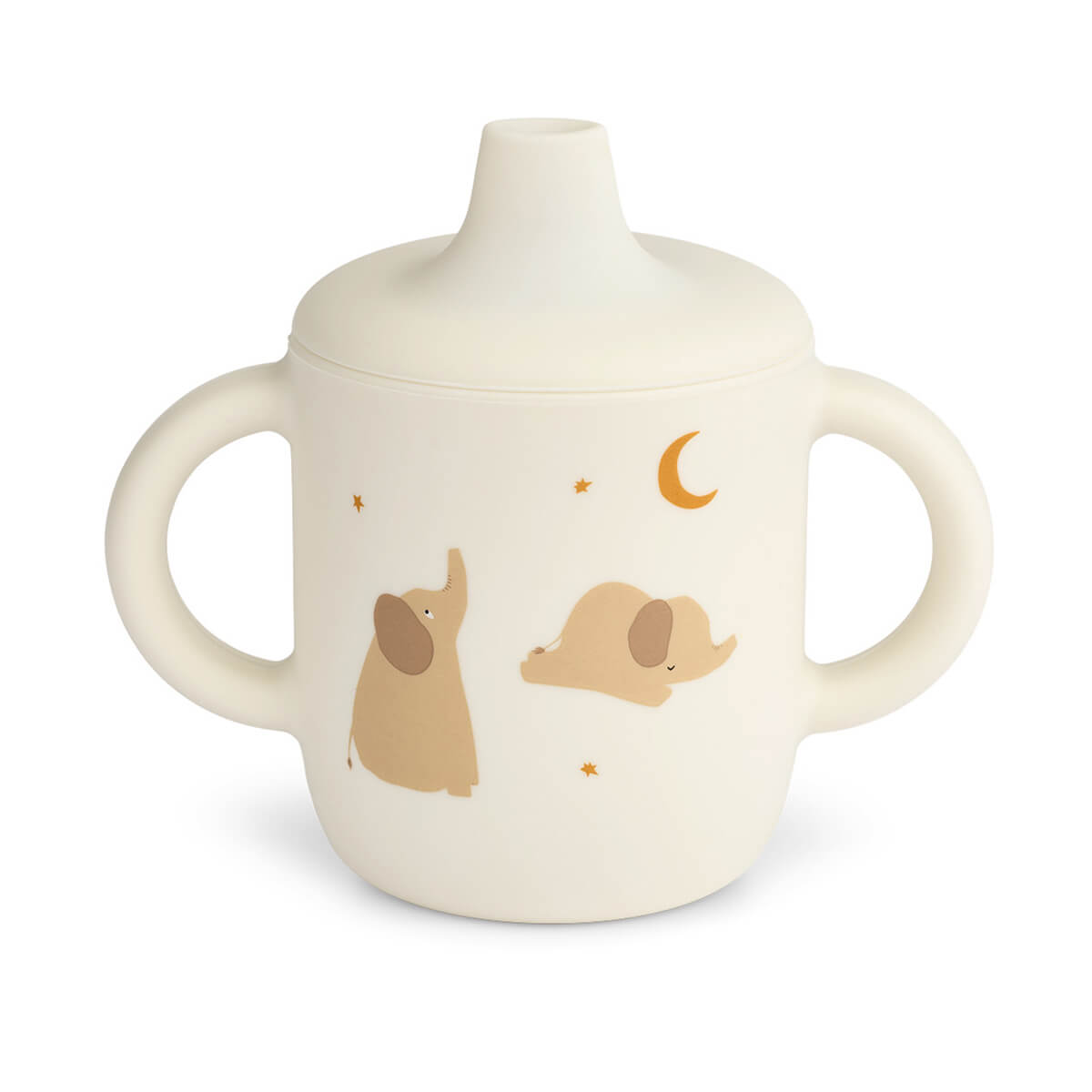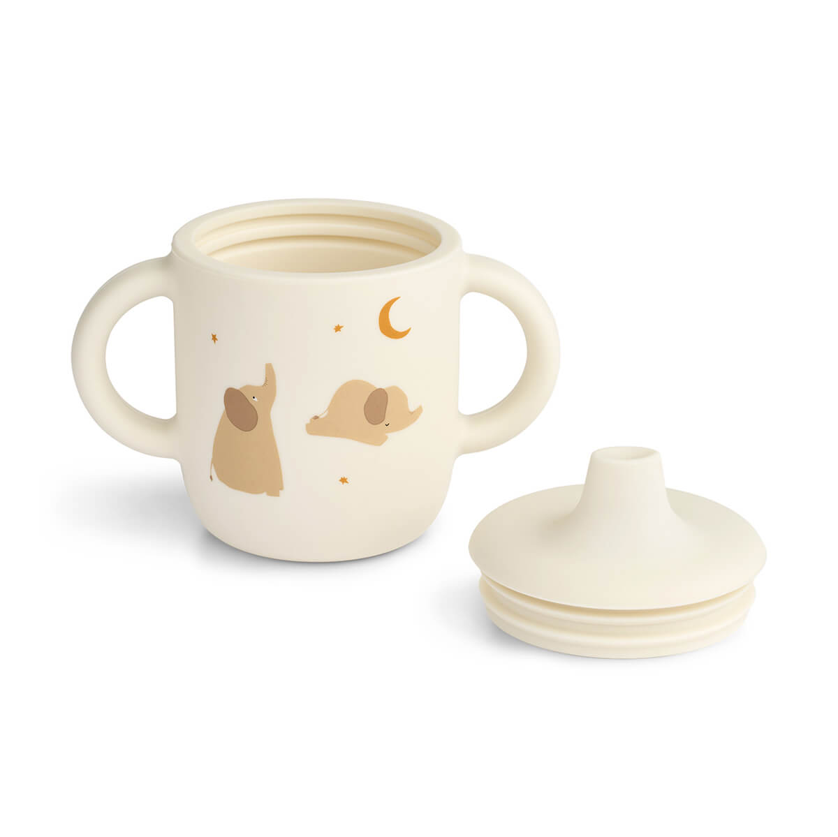 Neil sippy cup by Liewood. Perfect design for mastering the skills to drink. The “no-spill” cup has a removable lid with a small spout and smooth handles. The handles ensure a tight grip and allow the child to practice holding and tilting and prepare for using an open cup.