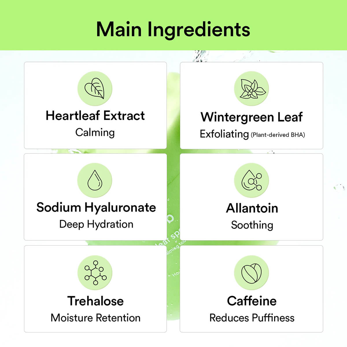 Ingredients: Water, Glycerin, Butylene Glycol, 1,2-Hexanediol, Houttuynia Cordata Extract, Althaea Rosea Flower Extract, Sodium Hyaluronate, Gaultheria Procumbens (Wintergreen) Leaf Extract, Hydroxyethyl Urea, Allantoin, Trehalose, Polyglyceryl-10 Laurate, Caprylyl Glycol, Polyglyceryl-10 Myristate, Ethylhexylglycerin, Pentylene Glycol, Acetyl Glucosamine, Hydroxyacetophenone, Sodium Hyaluronate Crosspolymer, Tocopherol, Biosaccharide Gum-4, Caffeine, Xanthan Gum, Disodium EDTA. Ingredients list offered as a guide only. For the most complete and up-to-date list of ingredients, please refer to product packaging.