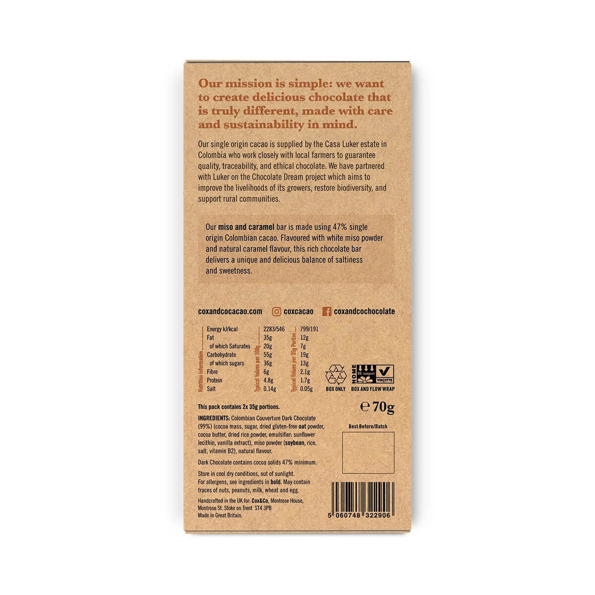 Miso & Caramel 47% Dark Chocolate Bar by Cox & Co. Our miso and caramel bar is blended using 47% cacao oat milk single origin Colombian cacao. Flavoured with white miso powder and natural caramel flavour, this rich chocolate bar delivers a unique and delicious balance of saltiness and sweetness.