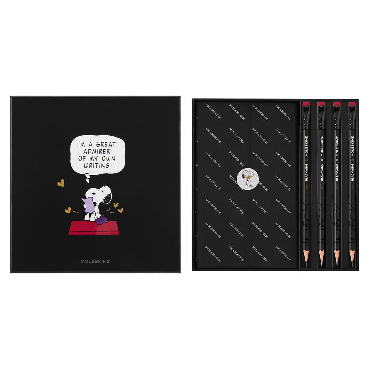 Peanuts Notebook & 4 Blackwing Pencils by Blackwing x Moleskine.  Capture thoughts, ideas, and doodles with this Peanuts x Moleskine Notebook and Pencil set —a celebration of simple truths and the power of handwriting. The gift box features a large, ruled notebook with iconic Peanuts graphics that highlight the joy of writing, along with 4 soft graphite pencils by Blackwing. Designed for both creativity and function, the notebook includes Peanuts-themed stickers, a paper bookmark, and customized endpapers. Its hard cover, elastic closure, and dual ribbon bookmarks ensure your notes stay secure and organised.