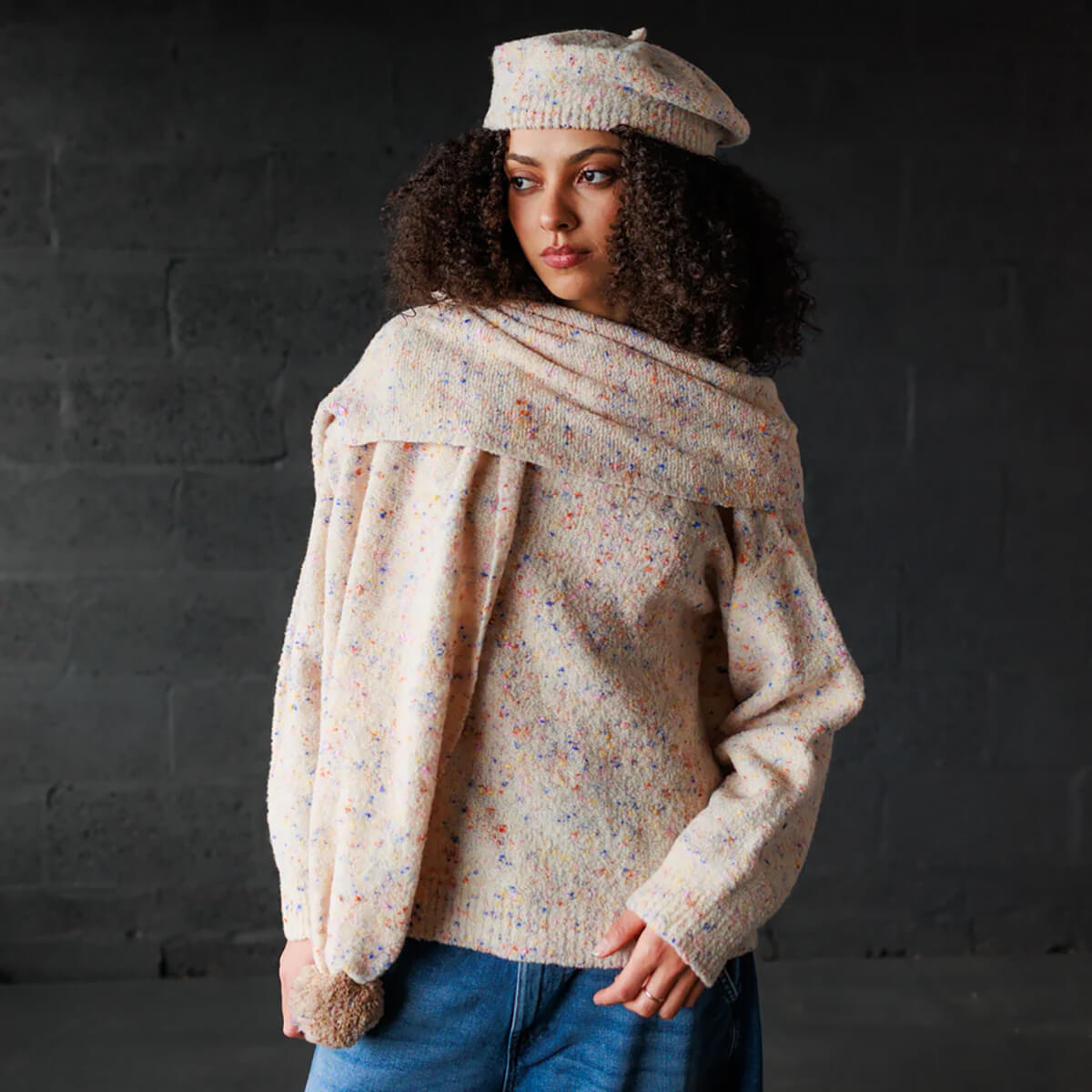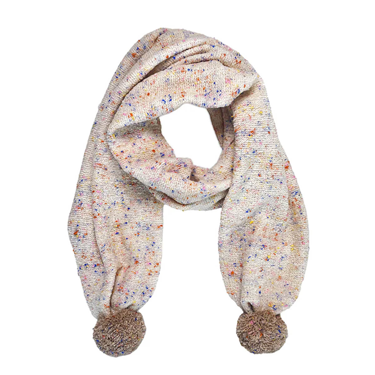 Women's Sprinkles Scarf by Mabli. A cosy scarf with contrast poms. Knitted in reverse stitch to accentuate the rainbow sprinkles twisted through the yarn.