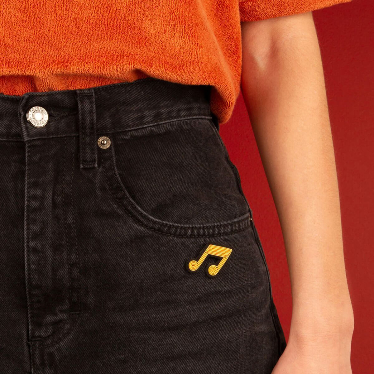 Double Note Hand Embroidered Brooch by Macon & Lesquoy. This tiny musical note brooch is the perfect gift for the musician in your life. Pin to your jacket, bag or even your guitar case.