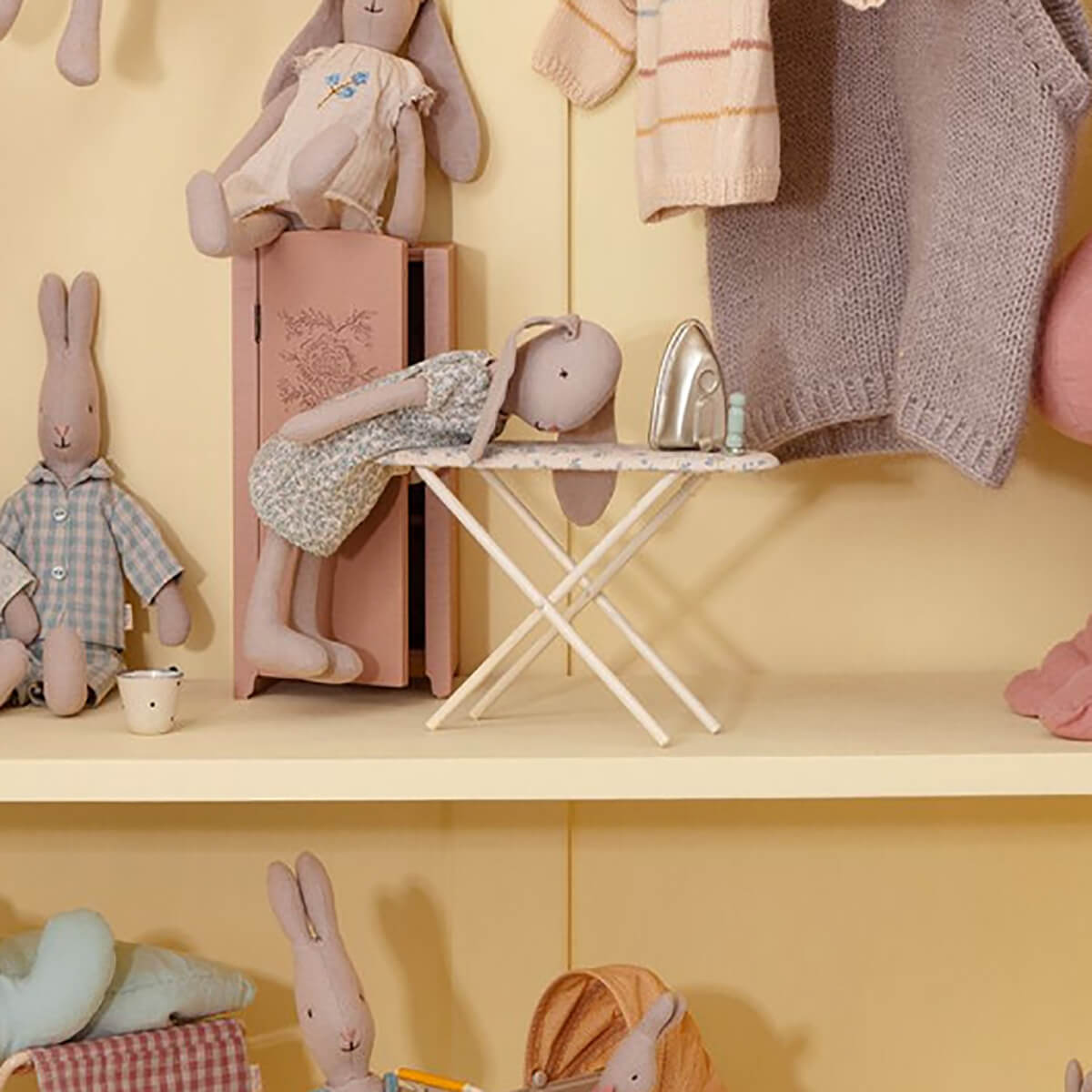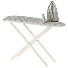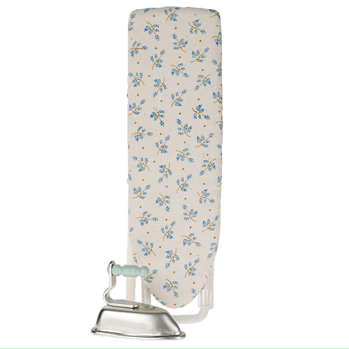 Iron and ironing board set in blue floral fabric by Maileg. To make the laundry room fully equipped, you must have an iron and iron board. This set will make the kids' play's even more authentic. The iron board is made of metal and covered with a unique blue floral Maileg fabric.
