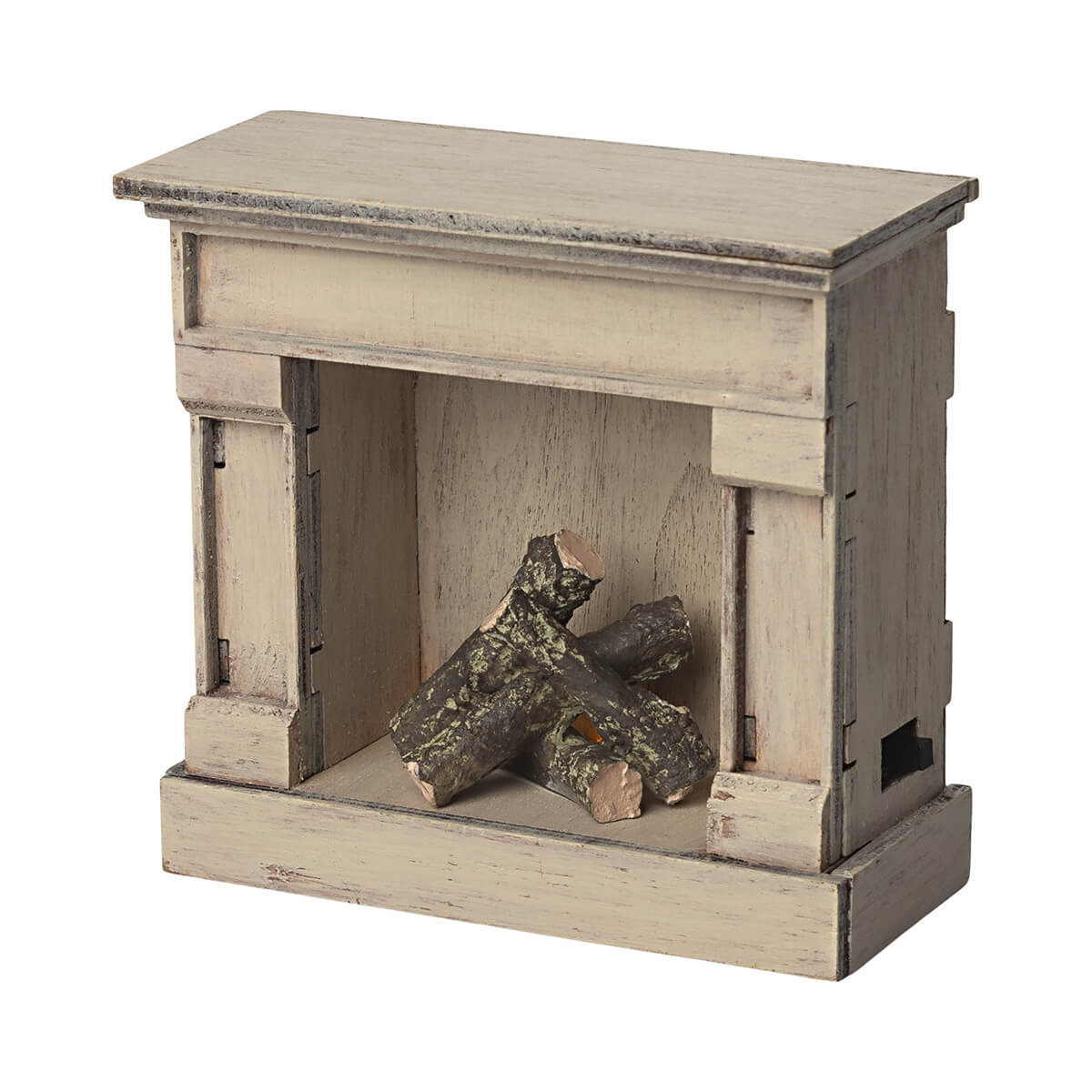 Miniature fireplace by Maileg. Use this wooden fireplace to warm your miniature home. It has an authentic look and a vintage finish. Remember to turn off the light when your friends go to bed. An adult can change the battery, which is non-rechargeable.