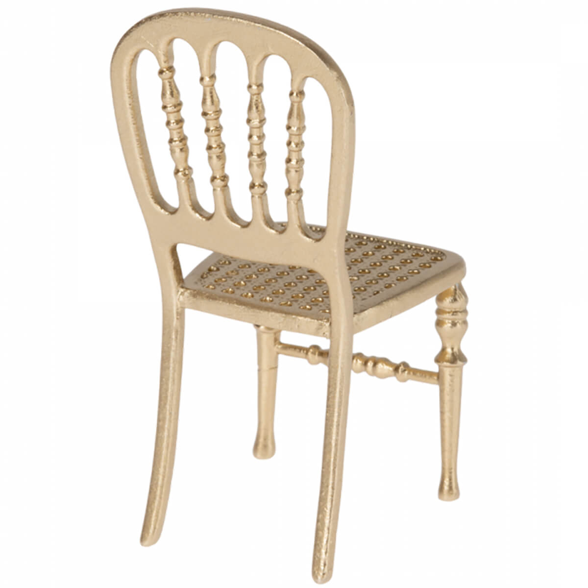 A perfect-sized chair for the mice family. It is made of metal with a golden finish and has the most beautiful details. This chair fits together with all tables in size mouse.