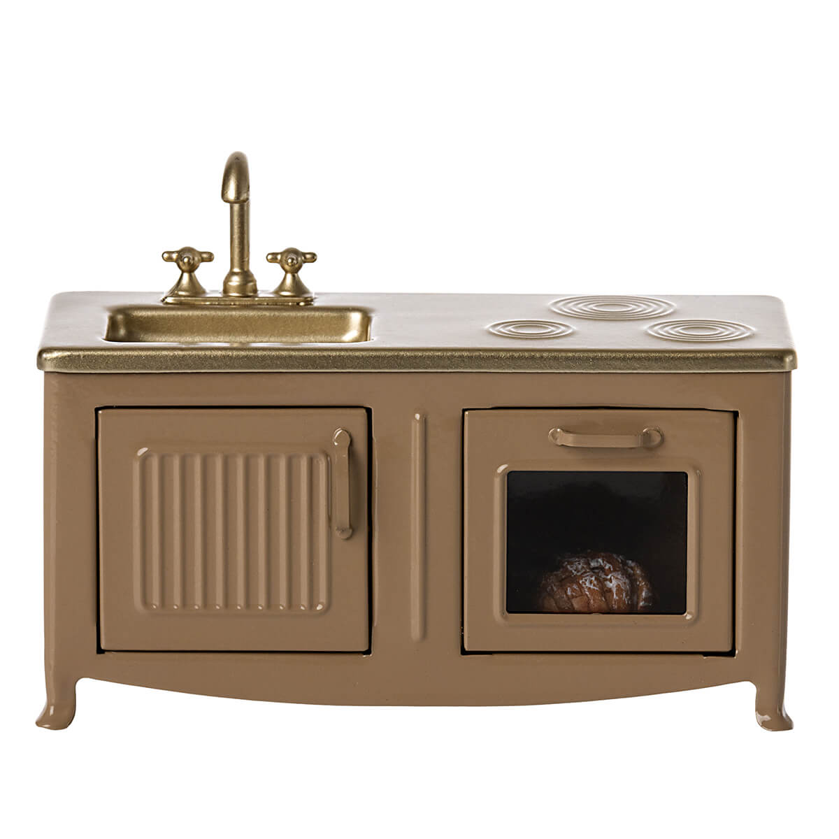 Mouse Kitchen by Maileg. The heart of every home is the kitchen. This metal kitchen has a beautiful color tone and has many playful details such as cabinet door, sink and an oven with a freshly baked pie. It is perfect in size for the mouse family.
