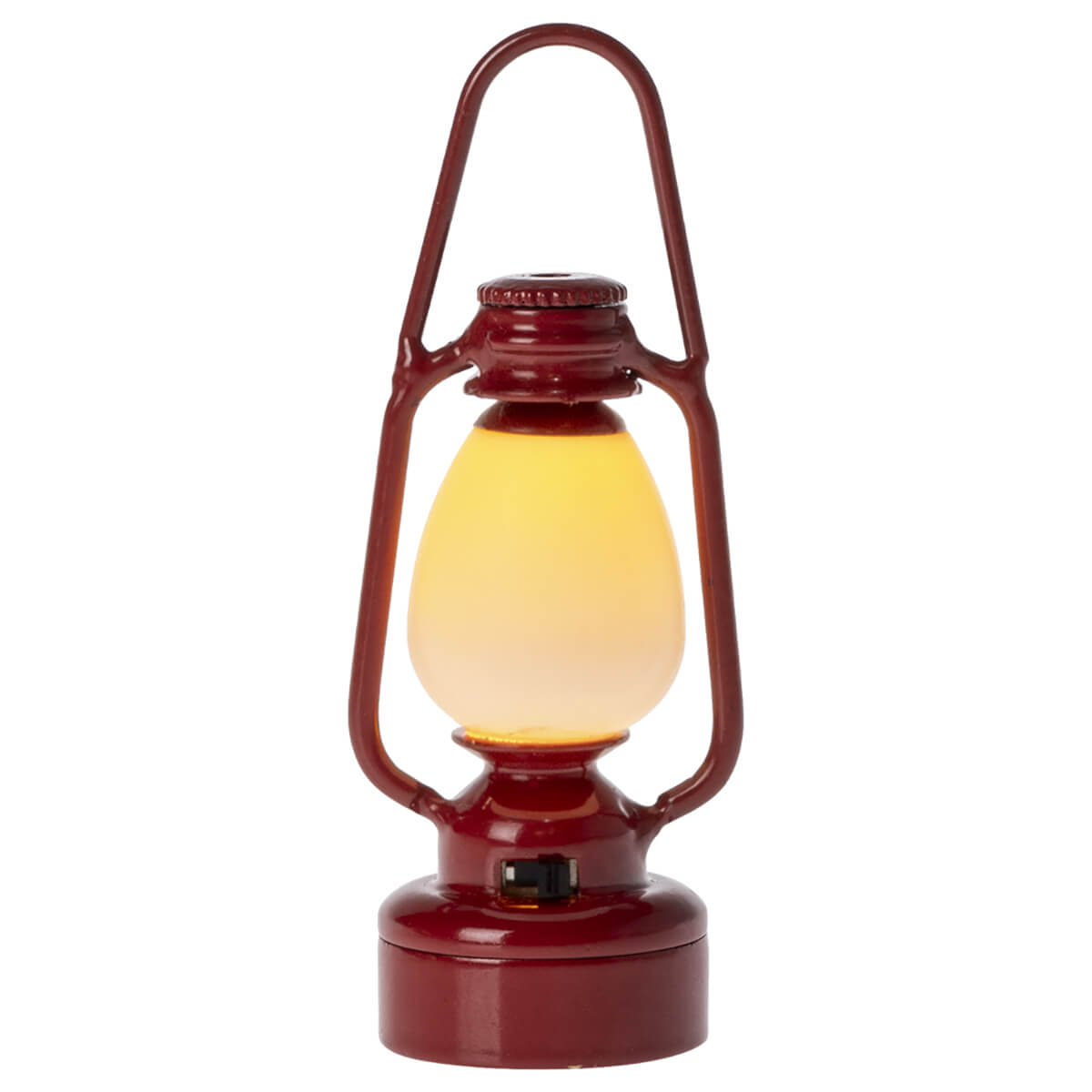 Vintage lantern in red by Maileg.  Light up the dark with this miniature lantern. Remember to turn off the light when your friends go to bed. The product comes without battery. Ann adult can add a coin cell battery (CR1632). The box contains a hex key to use for opening.