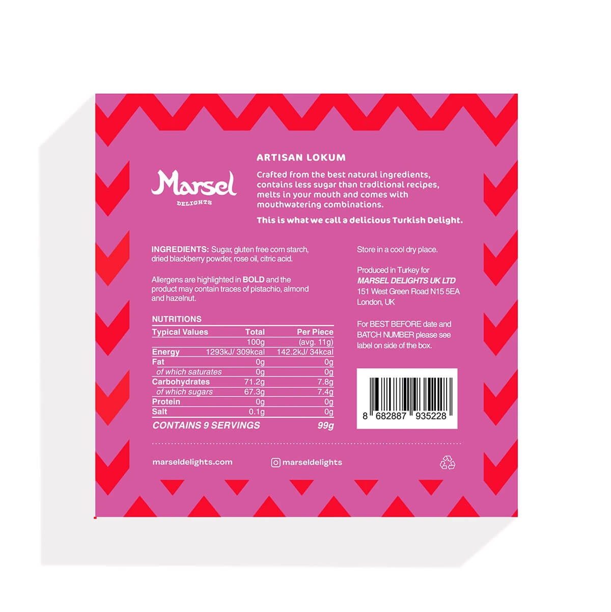Turkish Delight by Marsel Delights. Turkish cuisine’s delicate and healing elements meet in this rose and blackberry lokum. A light dusting of blackberry powder adds a subtle tartness that perfectly complements the fragrant floral notes of rose. Turkish Delight is a sweet treat enjoyed all around the world for centuries. This unique dessert has a rich history and cultural significance. It is also known as Lokum, an Arabic word meaning 'morsel' or 'little bite'.