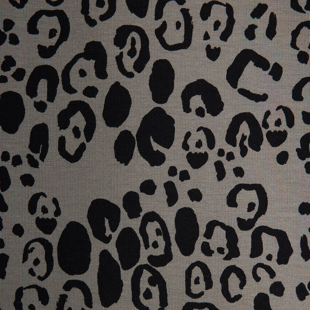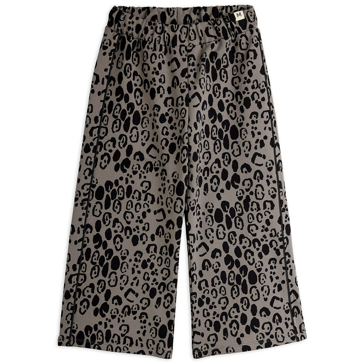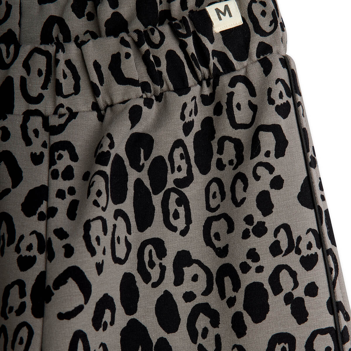 Leopard AOP Brushed Jersey Trousers by Mini Rodini. Grey leopard pants designed with a brushed interior and piping detail along each leg.