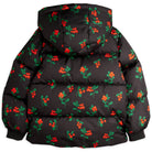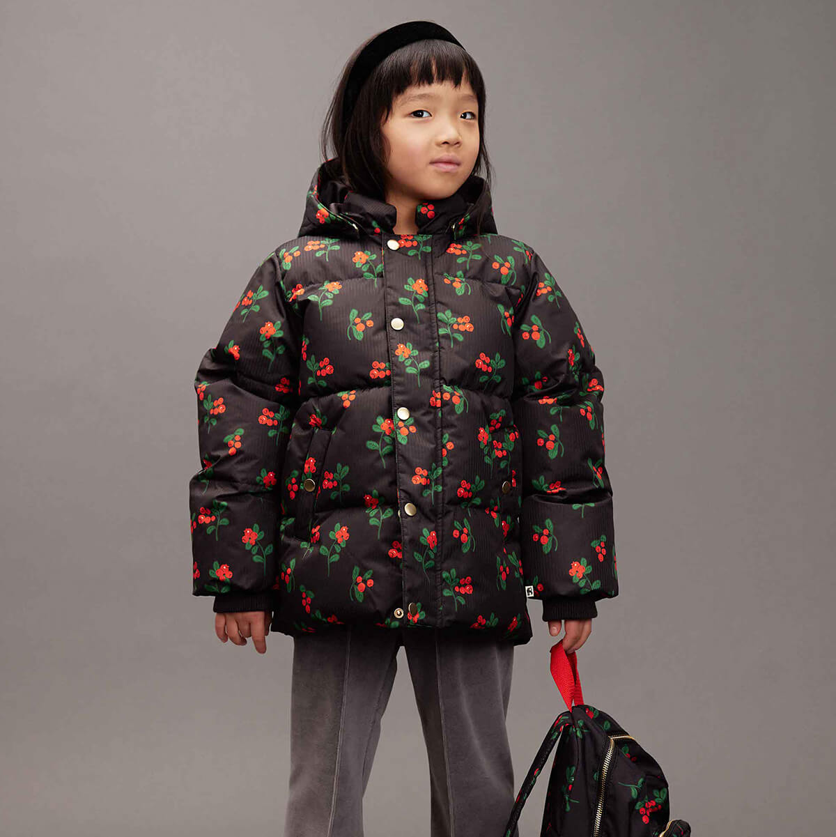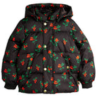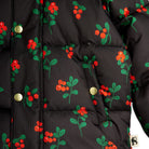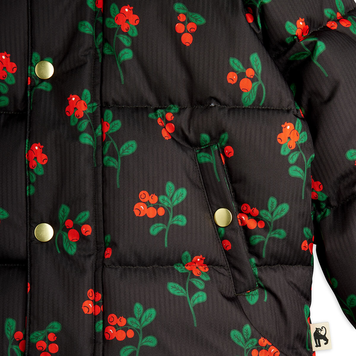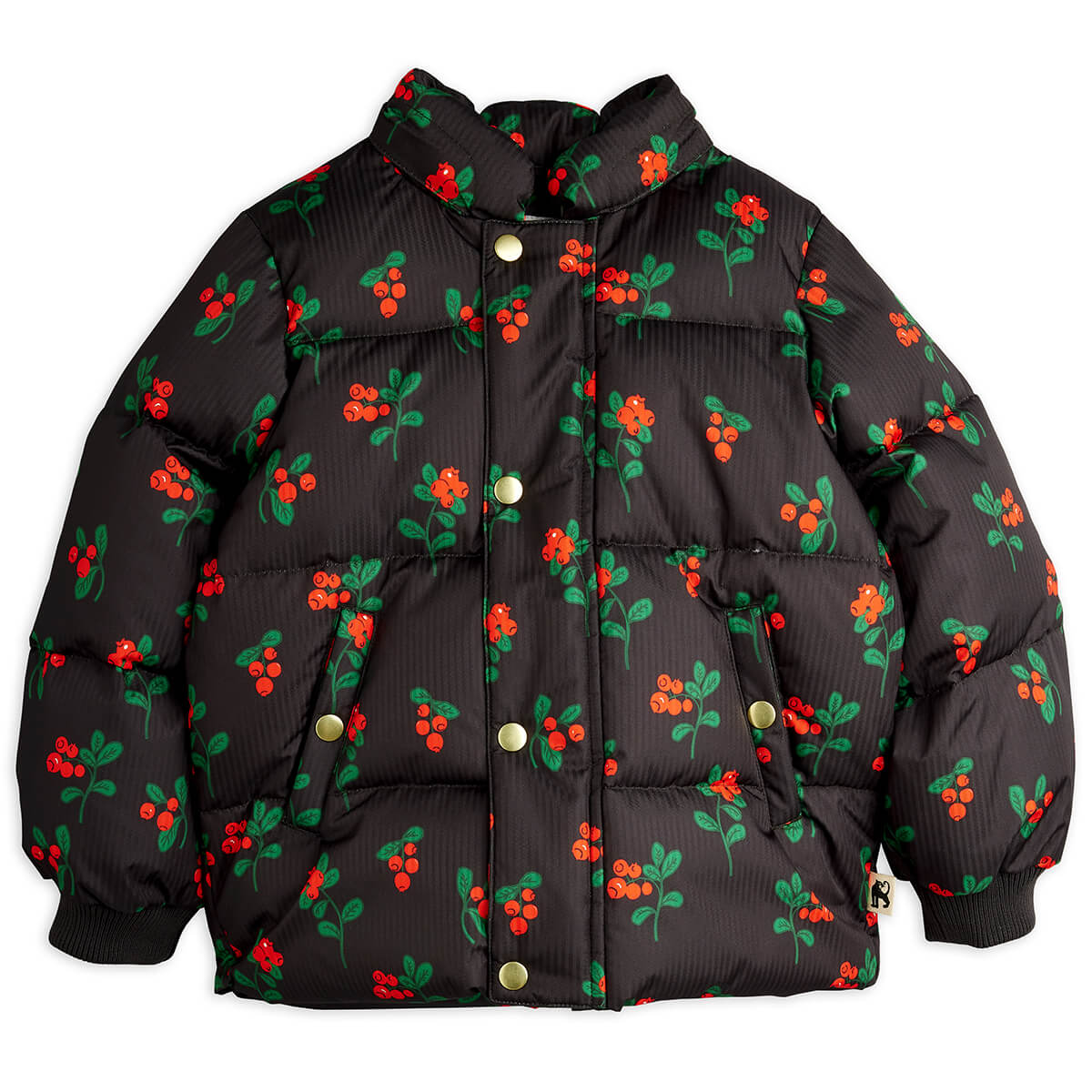 Lingonberries AOP Hooded Puffer Jacket by Mini Rodini. Black water repellent and wind proof puffer coat featuring a detachable hood, elasticated cuffs and two pockets.