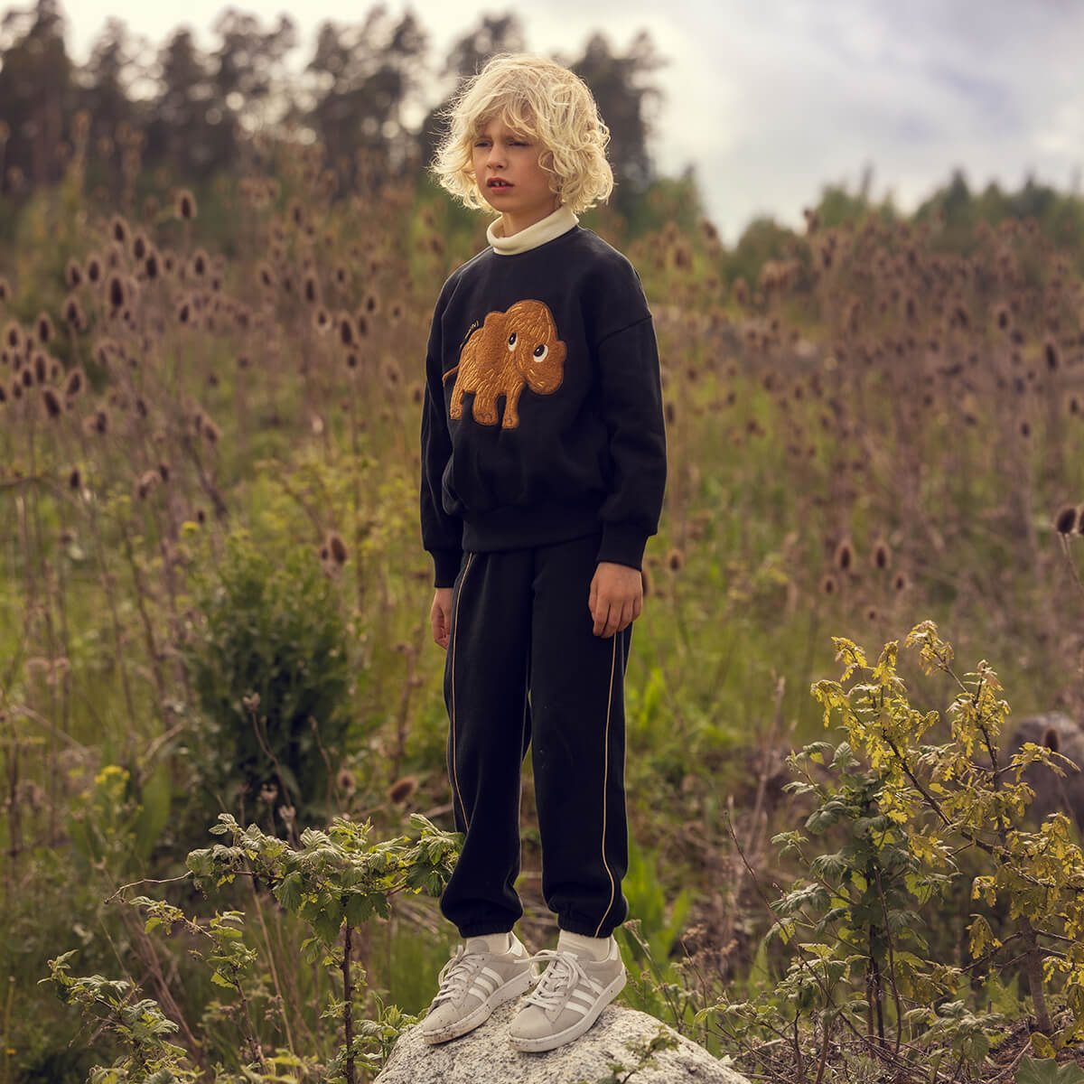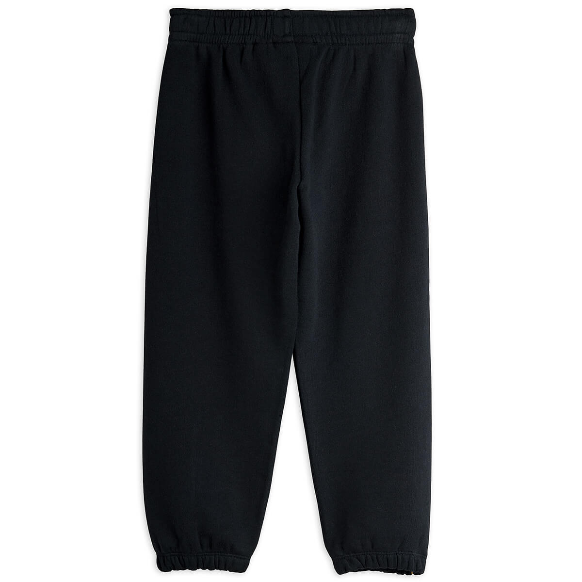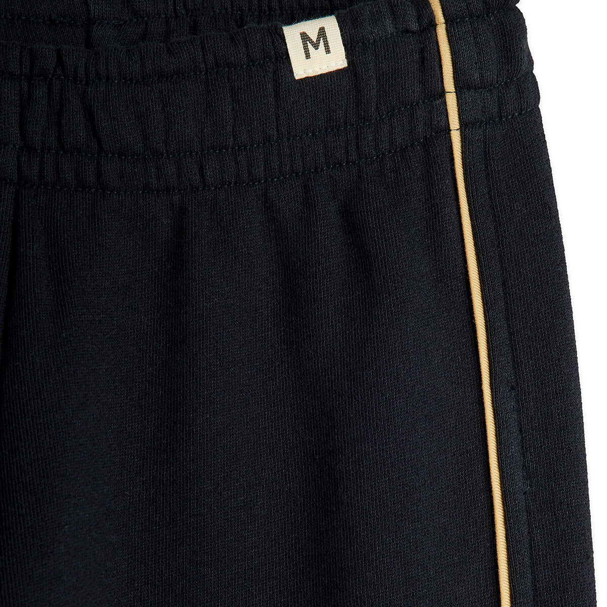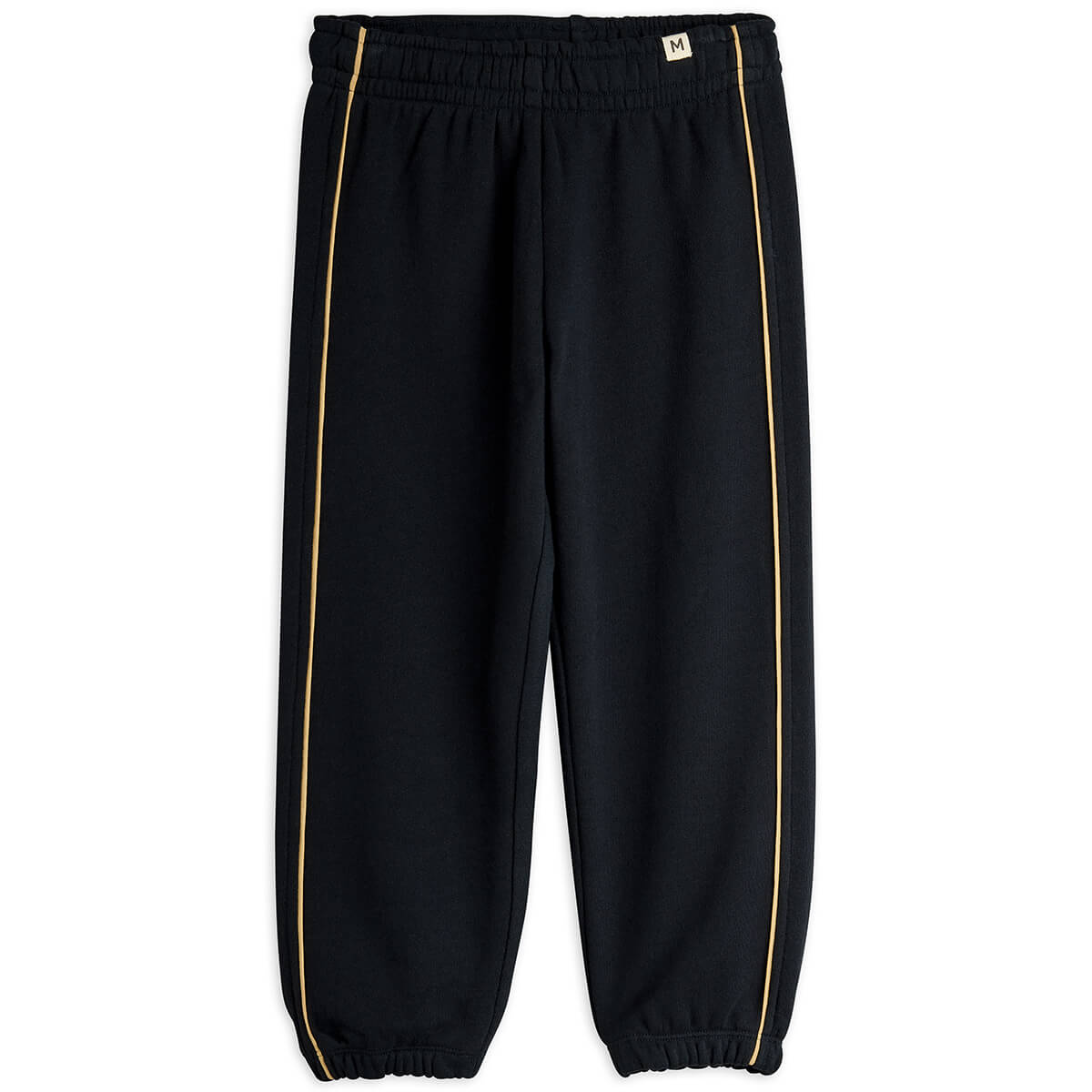 Plain Piping Sweatpants by Mini Rodini. Black joggers made from 100% organic cotton, featuring a relaxed fit, elasticated cuffs and a hidden drawstring.
