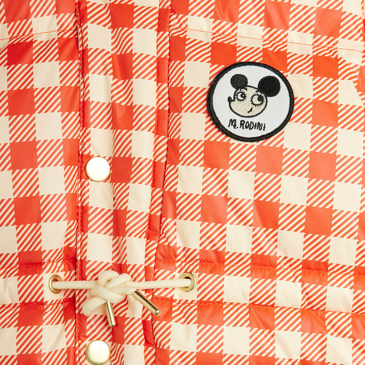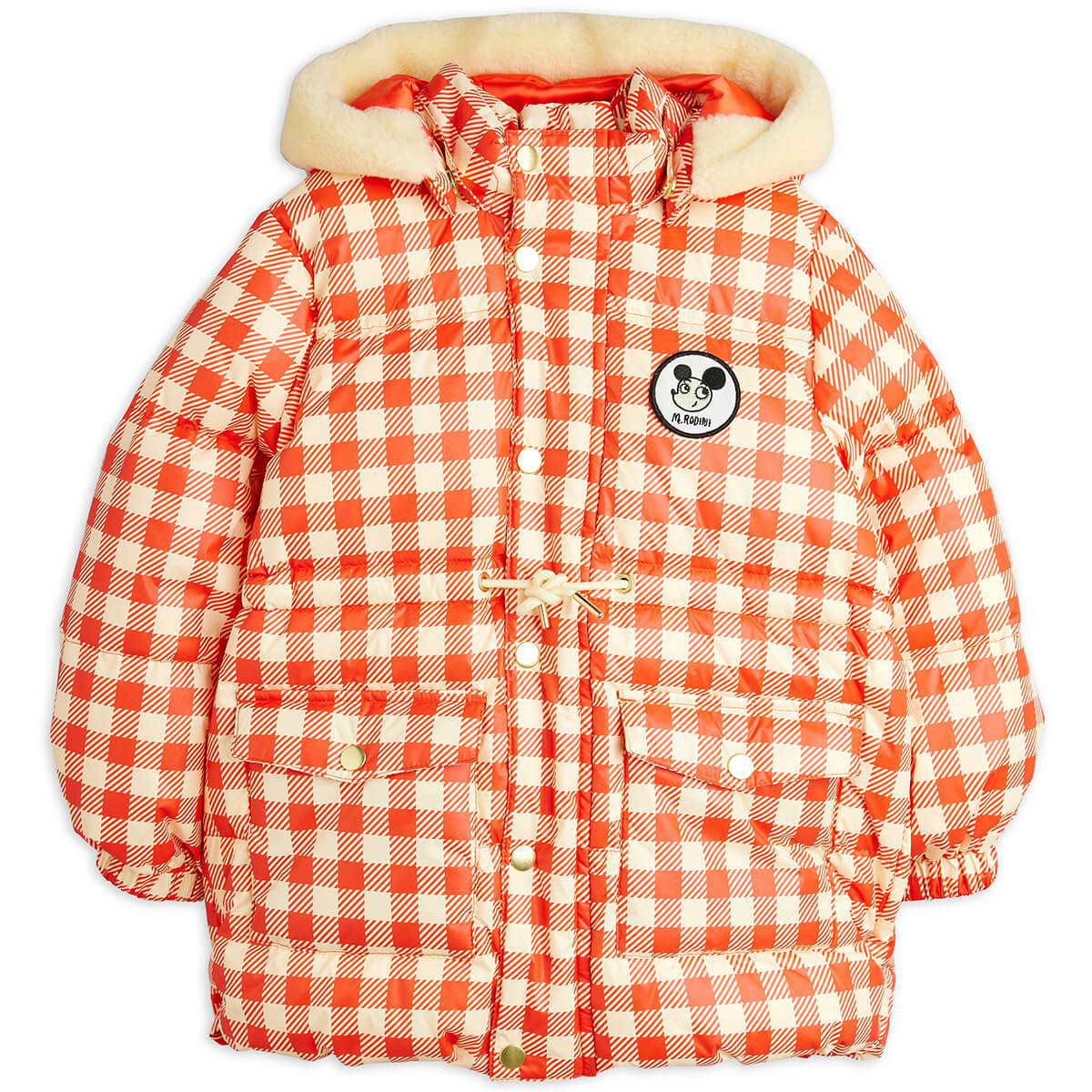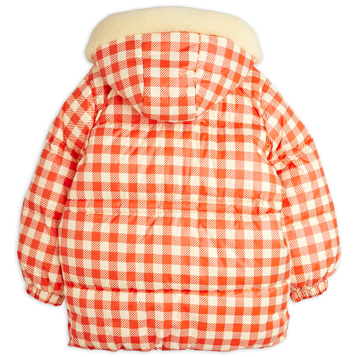 Ritzratz Patch AOP Heavy Puffer Jacket by Mini Rodini. Red gingham water repellent and wind proof puffer coat featuring a detachable hood with faux fur, elasticated cuffs and two pockets.