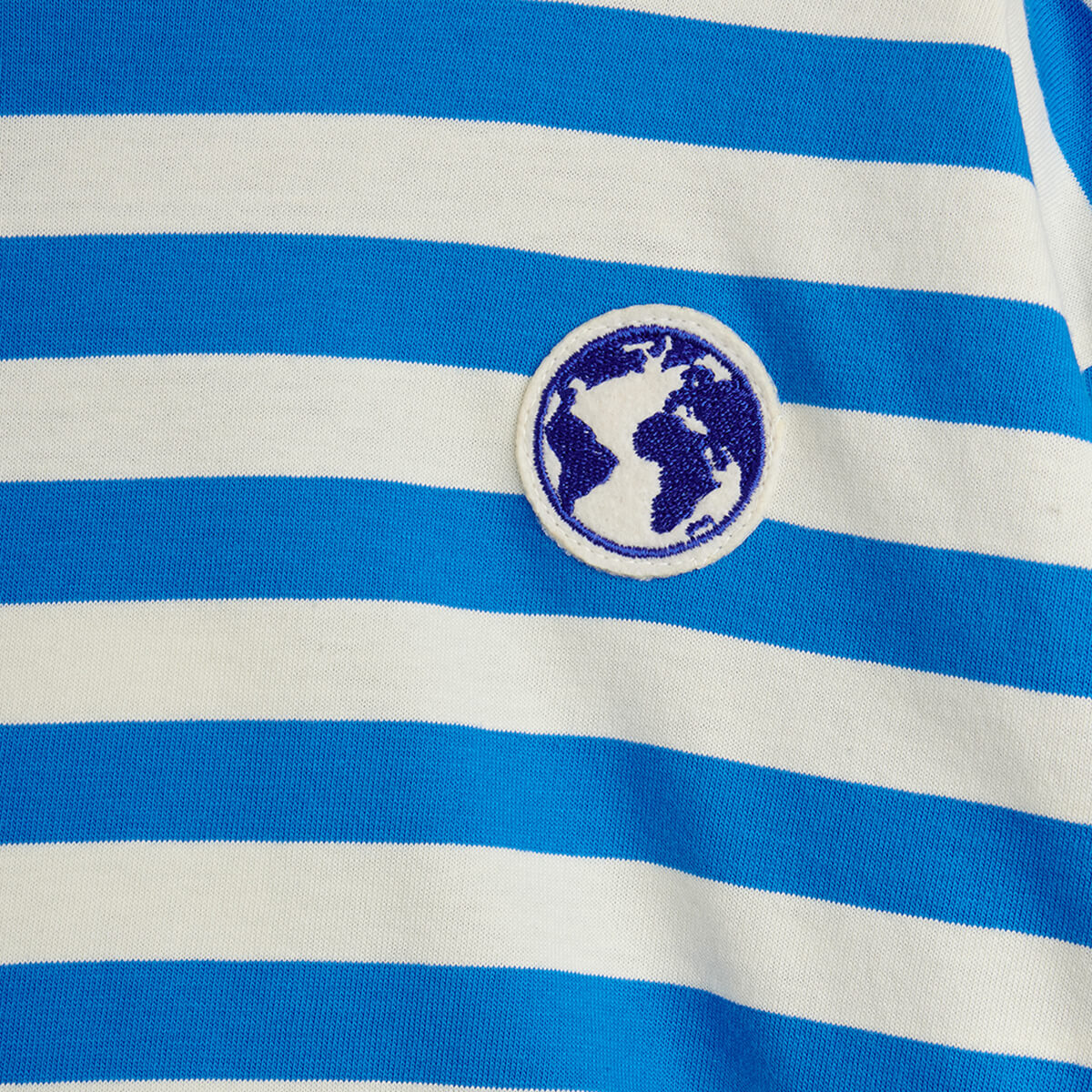 Earth Stripe Long Sleeve Tee by Mini Rodini. Yarn dyed long sleeve t shirt with an Earth motif patch at chest.