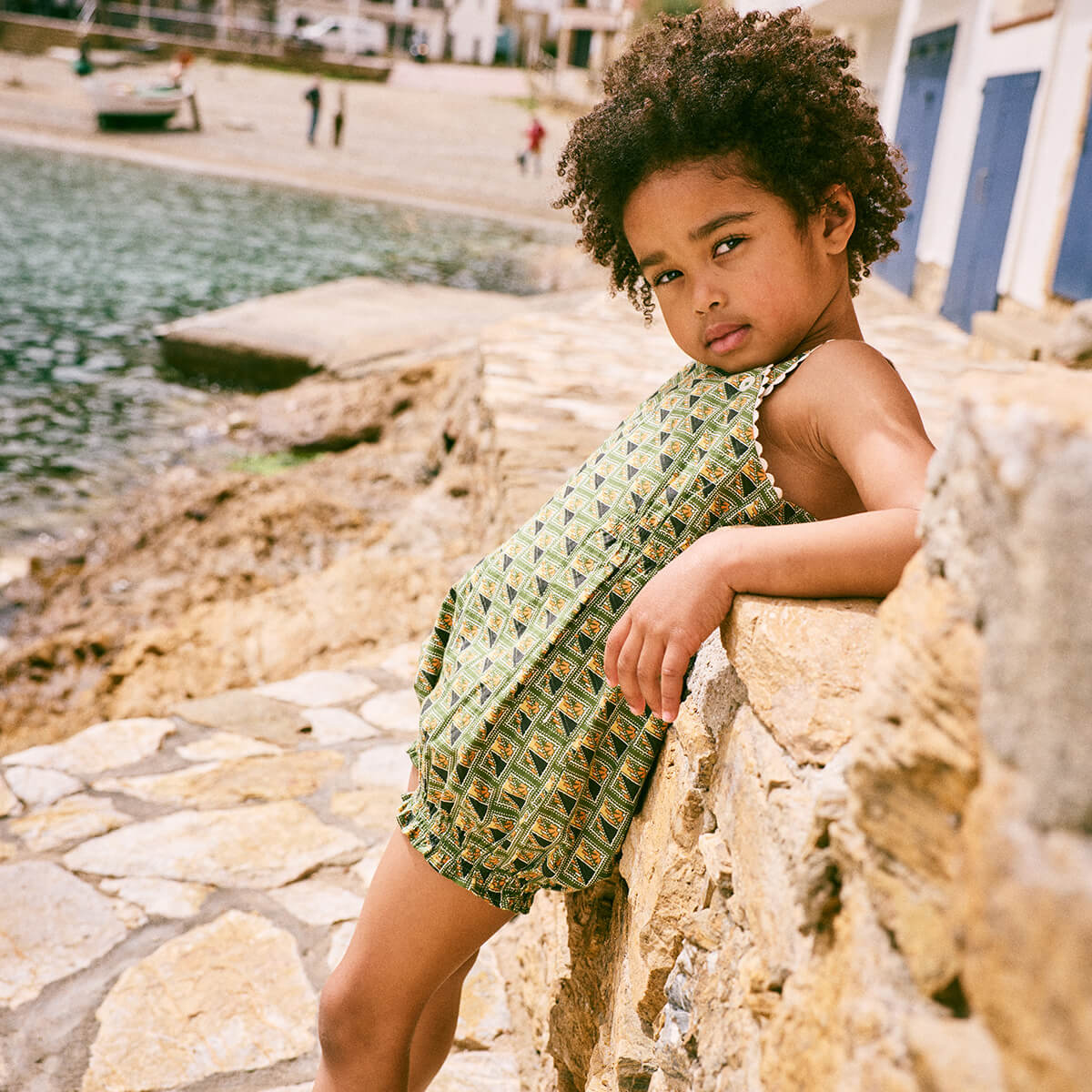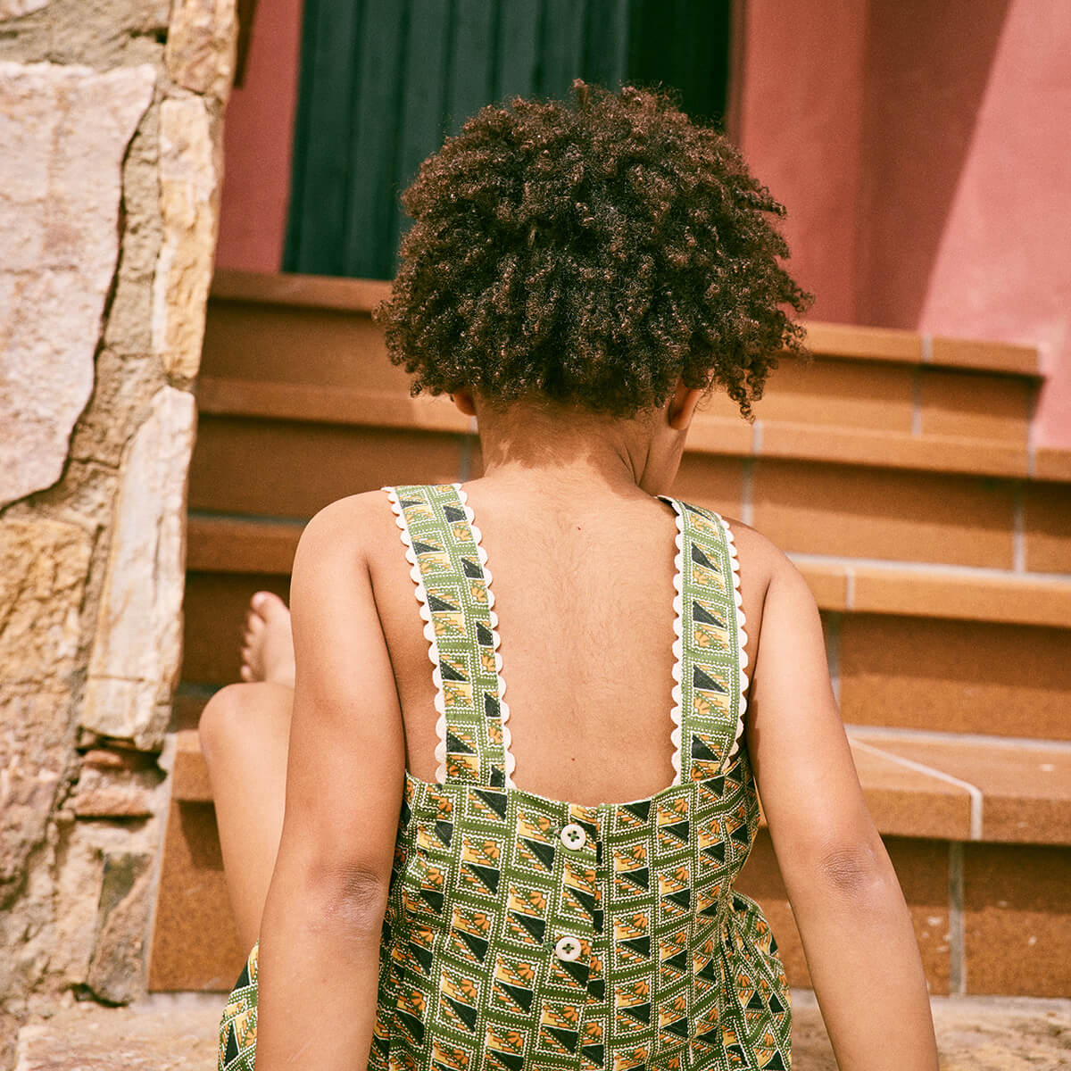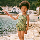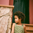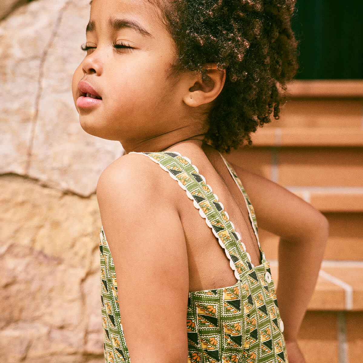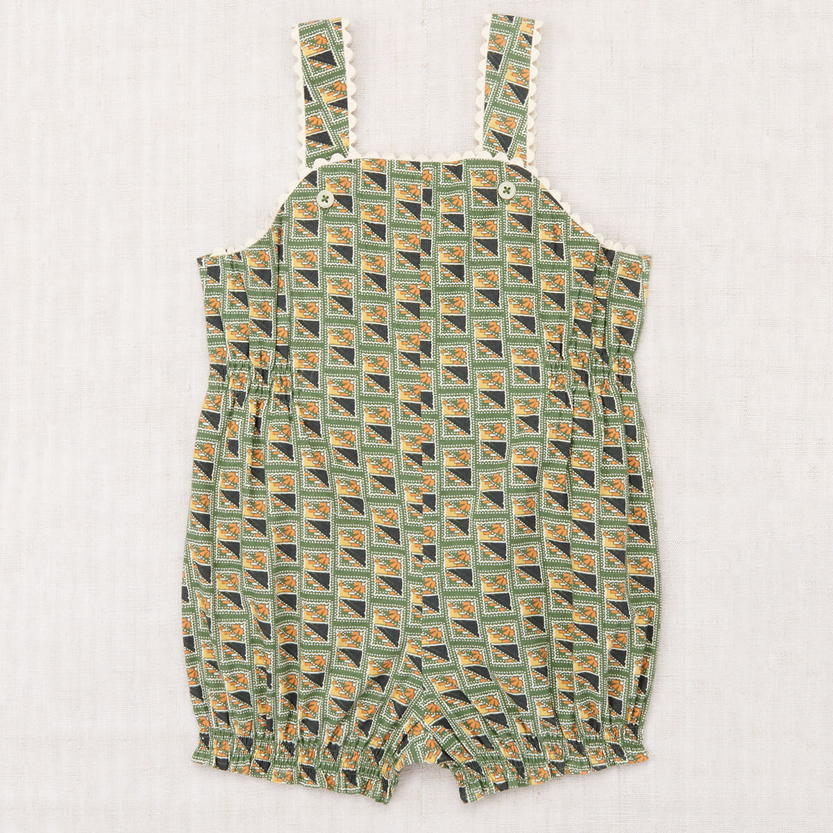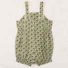 Bobbi Romper by Misha & Puff. A new summer playsuit in cotton poplin, with a cinched waist, bubble leg with ruffle elastic leg cuffs, adjustable straps with inset rickrack trim, and corozo button closure on the straps and down the center back. Finished with French Seams.