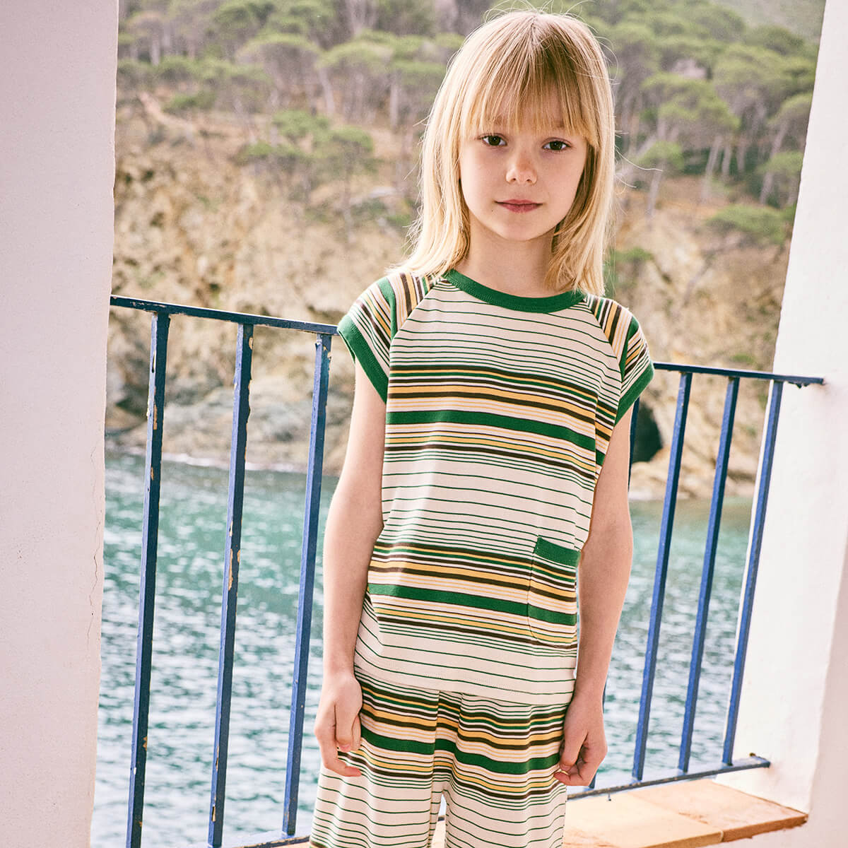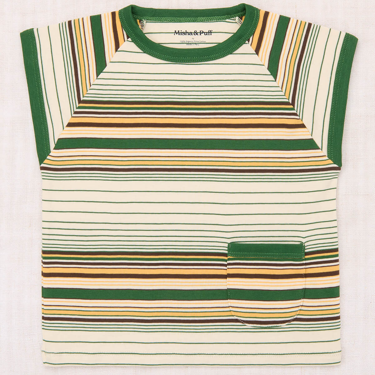 Muscle Tee by Misha & Puff. A muscle-style t-shirt in Pima cotton, featuring contrast trim and a front patch pocket. Each colour of the stripes featured in this style are dyed separately and then knit together, creating colours that last longer.