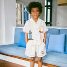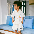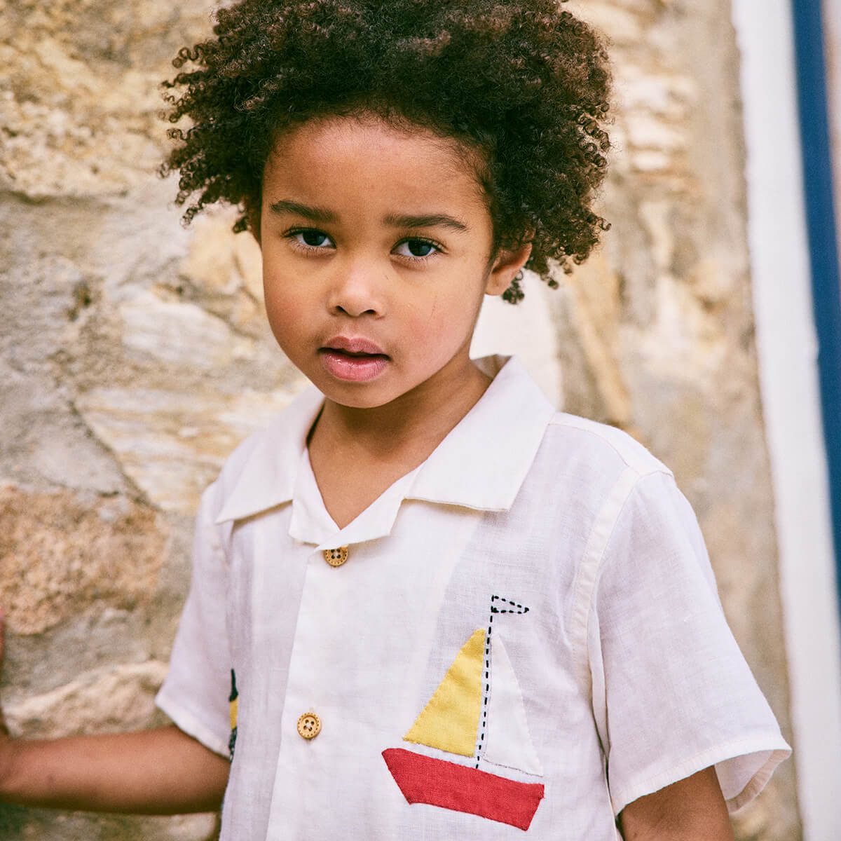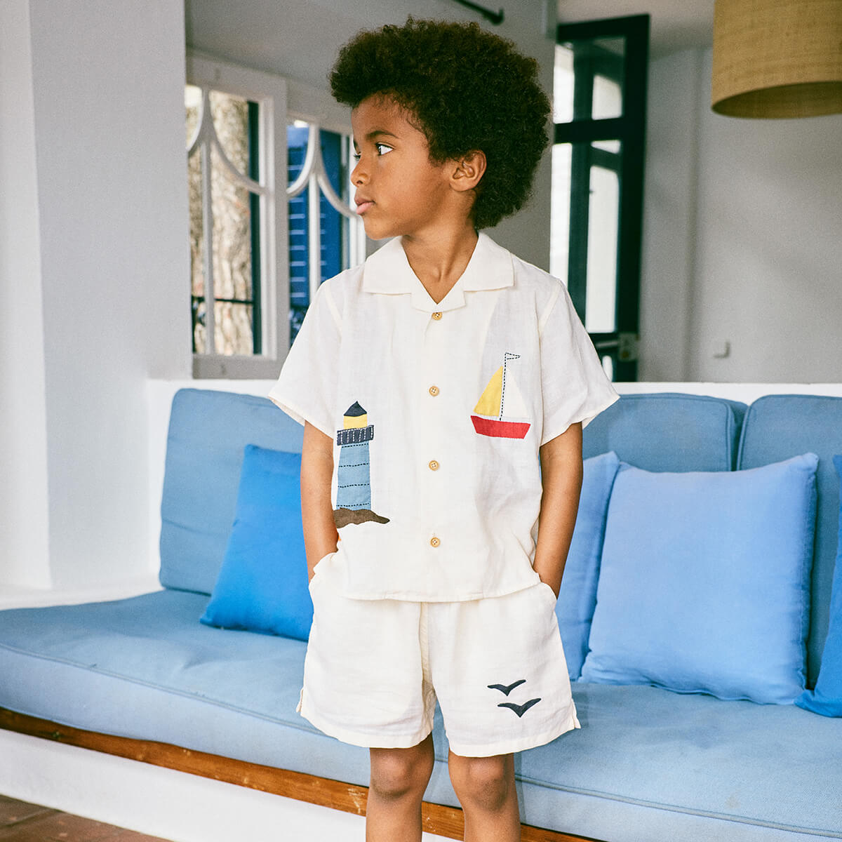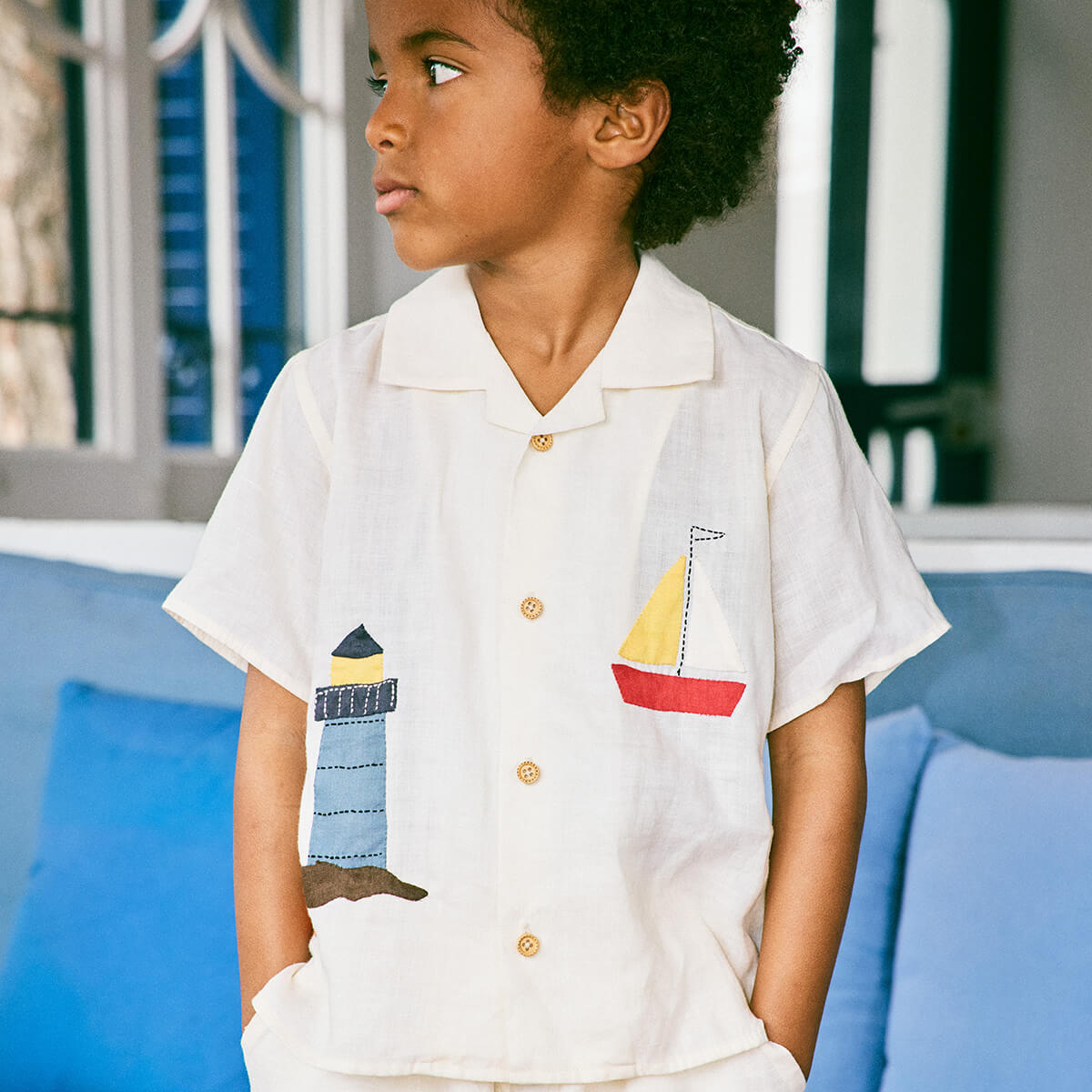 Seaside Leon Top by Misha & Puff. A short-sleeved shirt in woven linen, featuring a point collar, rounded hem with side vents, wooden button closure, and hand-applied seaside appliqué motifs with hand-embroidered details. Finished with French seams.